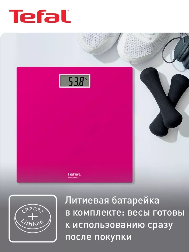 Напольные весы Tefal Premiss PP1403V0. Простые и удобные весы в элегантном лаконичном дизайне. С простыми и удобными напольными весами Premiss от Tefal взвешиваться каждый день или время от времени - легко! Тонкая и широкая платформа домашних весов выполнена из закаленного стекла и выдерживает вес до 150 кг, имеет большой цифровой дисплей и функцию автоматического включения и выключения. Готовы к использованию. В комплект входит литиевая батарейка, поэтому весы можно использовать сразу после покупки. Умные весы. Встаньте на весы, чтобы они "проснулись" и показали ваш точный вес. Техника для дома автоматически выключается через 5 секунд после того, как вы закончили их использовать.