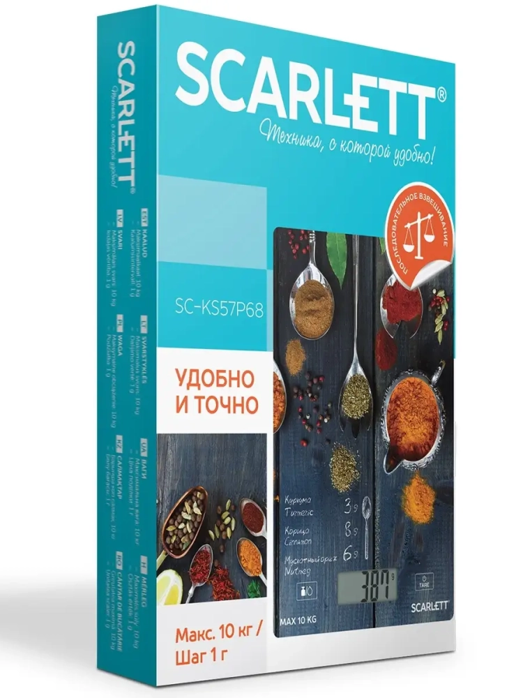 Электронные кухонные весы Scarlett в ярких эффектных дизайнах не оставят равнодушной ни одну хозяйку, станут отличным подарком на любой праздник. Возможность измерять не только в привычных нам граммах и килограммах, но и в фунтах и унциях и даже в миллилитрах позволит Вам готовить блюда по рецептам со всего мира, не заморачиваясь с пересчётом. Функция ТАРА не учитывает массу посуды при взвешивании продуктов, благодаря чему можно измерить вес с точностью до 1 грамма. Сенсорный экран управления предупредит Вас о превышении груза на весах (8 кг или 10 кг), а также о необходимости заменить батарейку. После трех минут бездействия весы выключатся автоматически и сэкономят заряд батареи, которая идет в комплекте.
