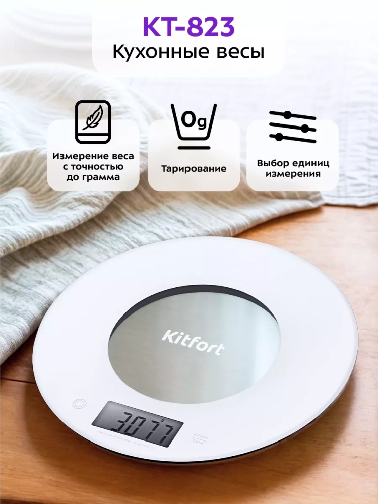 Весы КТ-823 имеют простое управление. Благодаря компактному размеру и стильному дизайну они впишутся в любой интерьер.