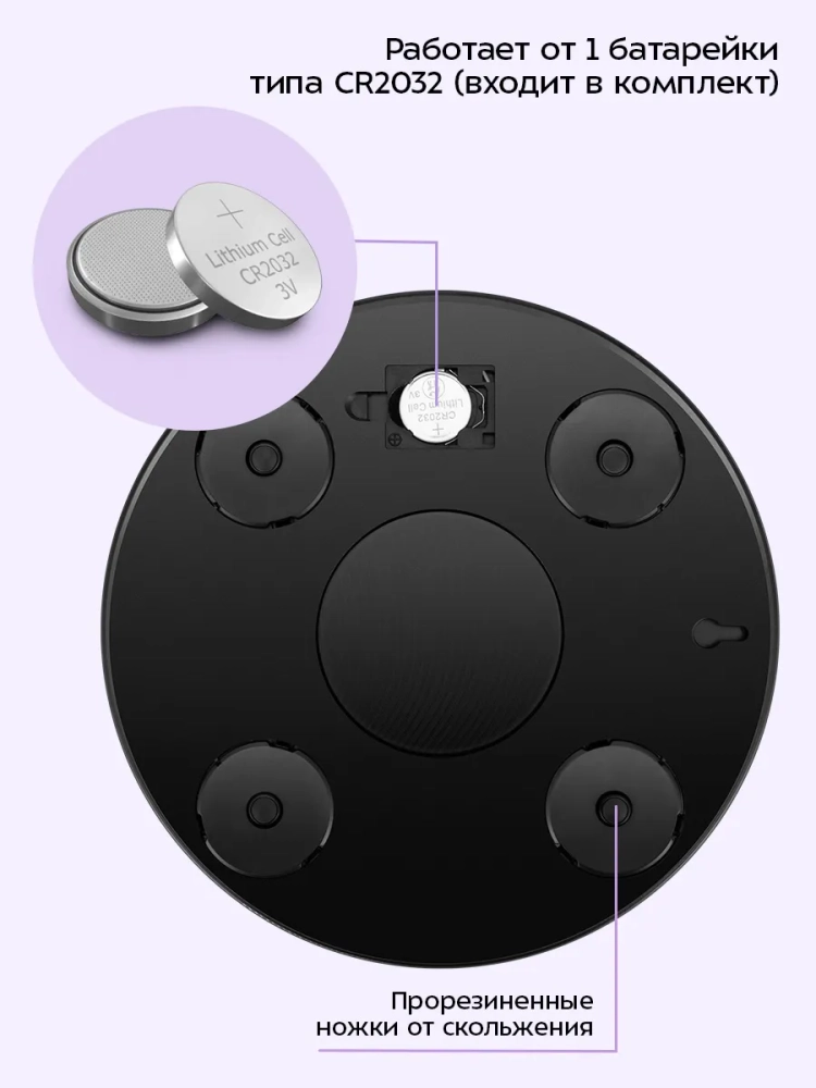 Весы работают от одной батарейки типа CR2032 (входит в комплект).