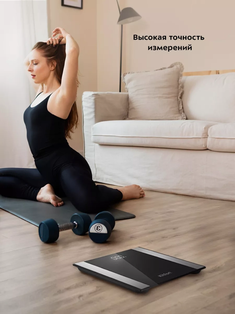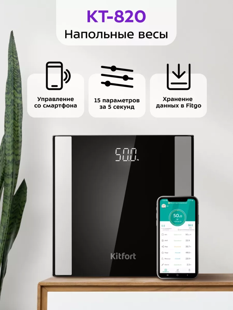 Электронные напольные весы обеспечивают высокую точность измерения, что очень важно людям, следящим за своим весом. Весы Kitfort КТ-820 представляют современное поколение «умных» весов, поскольку их можно подключить к приложению FitGo, включив передачу данных через Bluetooth. Приложение выводит на экран телефона разные параметры биоимпедансного анализа: вес, индекс массы тела, мышечную массу, костную массу, процентное содержание воды и жира в организме и т.д.