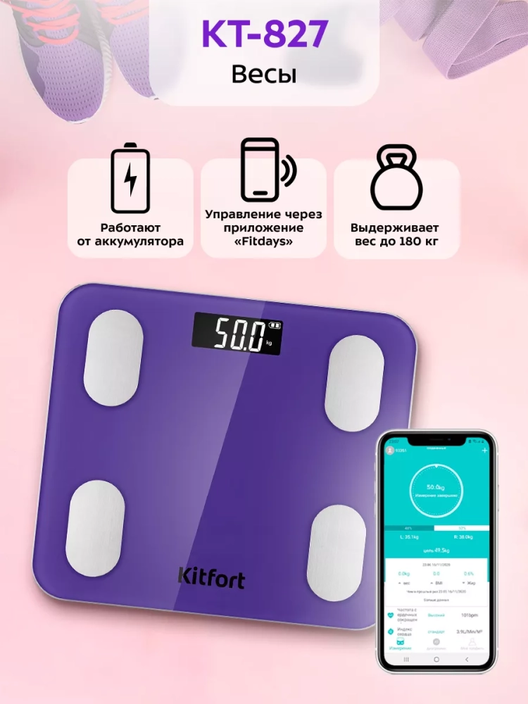 Электронные напольные весы обеспечивают высокую точность измерения, что очень важно людям, следящим за своим весом. Весы Kitfort КТ-827 представляют современное поколение «умных» весов, поскольку их можно подключить к приложению FitGo, включив передачу данных через Bluetooth. Приложение выводит на экран телефона разные параметры биоимпедансного анализа: индекс массы тела, мышечную массу, процентное содержание воды и жира в организме и т.д.