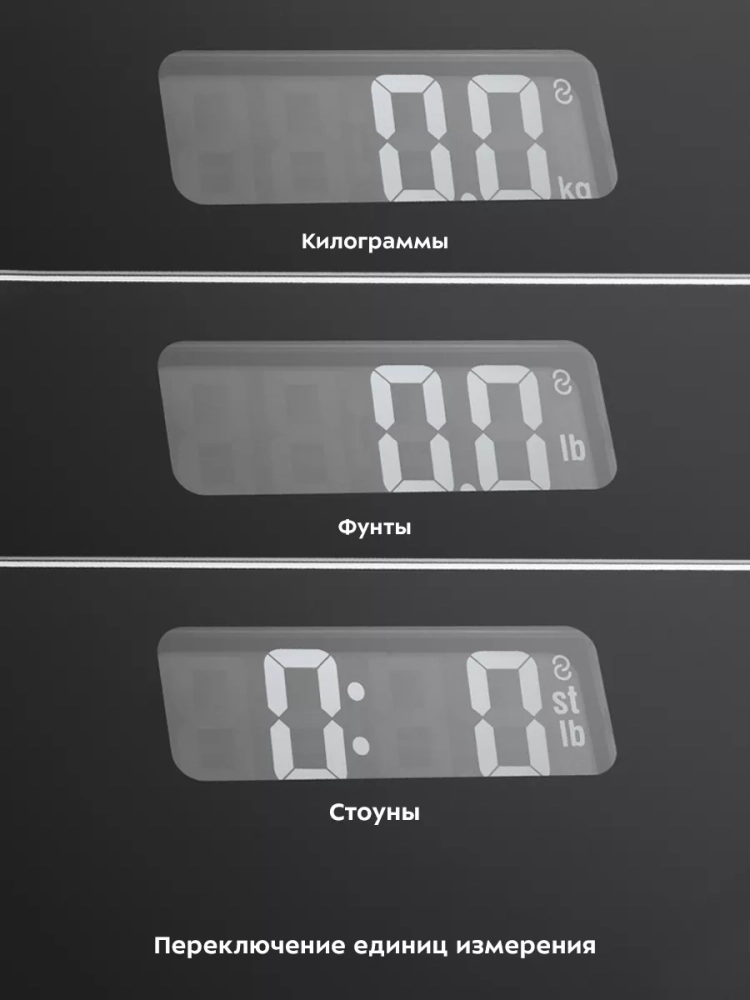 Весы оснащены жидкокристаллическим дисплеем с крупными цифрами, что делает их использование максимально удобным. Платформа выполнена из высокопрочного полированного стекла, а прорезиненные ножки обеспечивают дополнительную устойчивость весам и предотвращают их скольжение по полу, что гарантирует безопасность во время взвешивания. Токопроводящие электроды вмонтированы в платформу, они необходимы для проведения биоимпедансного анализа.
