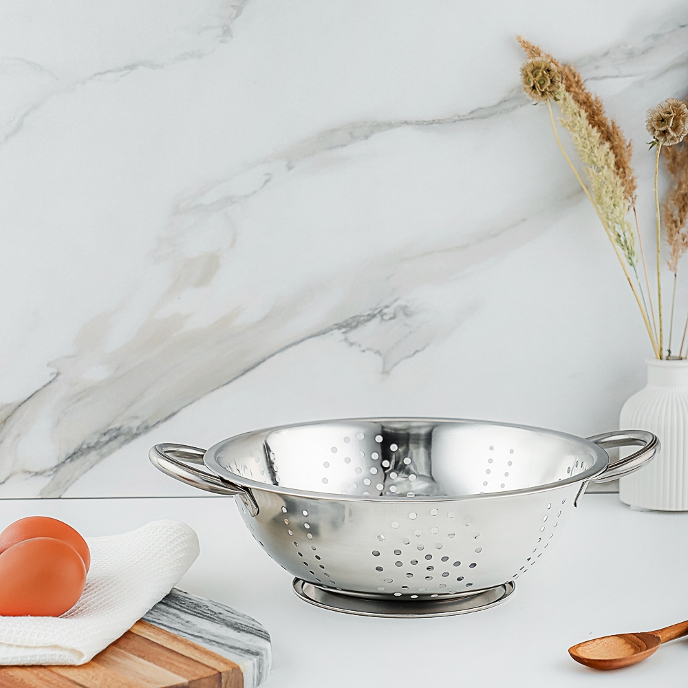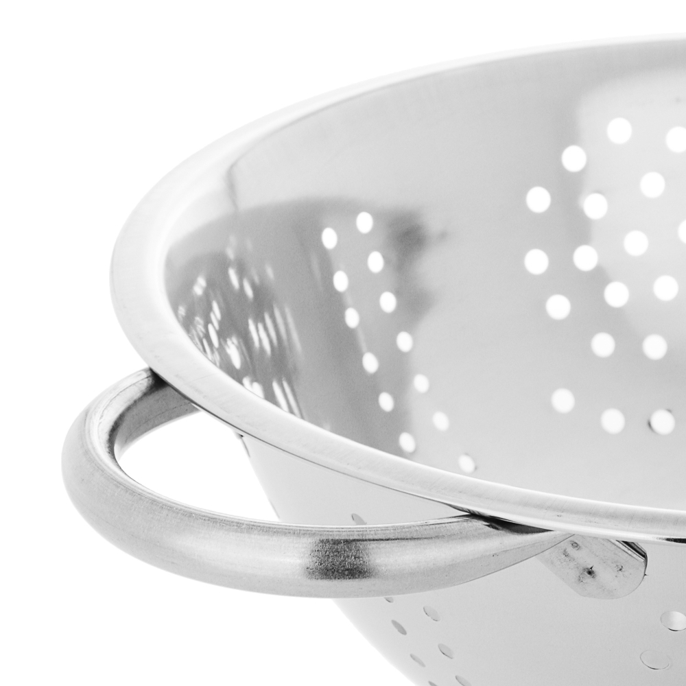 Дуршлаг на ножке из нержавеющей стали диаметром 24 см поможет слить консервированные продукты, промыть крупы и ягоды. Незаменимый помощник во время приготовления картофеля и макаронных изделий. Нержавеющая сталь не подвержена коррозии, поэтому изделие прослужит много лет. Плоское дно обеспечивает устойчивость. Две удобные ручки по бокам позволяют комфортно переносить дуршлаг, не обжигаясь и не повреждая готовые продукты.