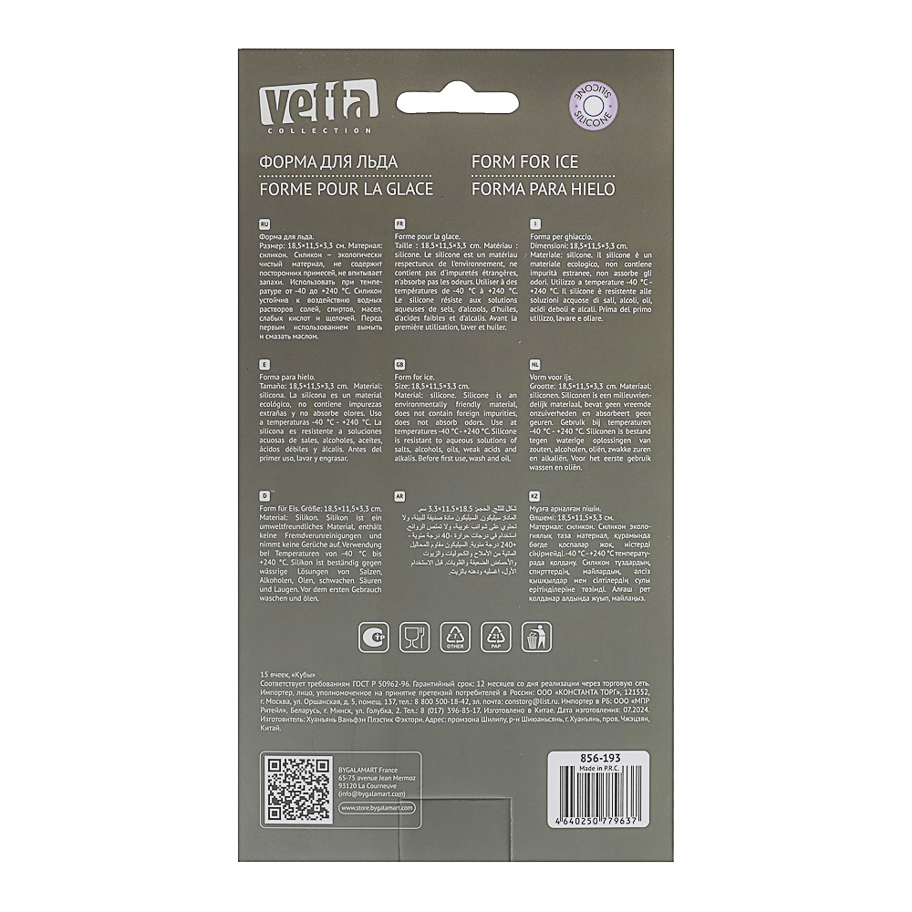 Силиконовая форма для льда VETTA "Кубы" размером 18,5х11,5х3,3 см – удобное приспособление для приготовления льда, желе, заморозки продуктов или соусов. Процесс заморозки ингредиентов с этой формой очень прост. Вам нужно просто заполнить ячейки формы водой или другой жидкостью, поместить ее в морозильную камеру, а затем через несколько часов достать готовые кубики льда. Благодаря мягкому силикону, лед легко извлекается из формы и не повреждается при этом. Силикон – экологически чистый материал, не содержит посторонних примесей, не впитывает запахи. Количество ячеек – 15. Можно использовать при температуре от -40 до +240 °С. Силикон устойчив к воздействию водных растворов солей, спиртов, масел, слабых кислот и щелочей. Перед первым использованием рекомендуется форму вымыть и смазать маслом.