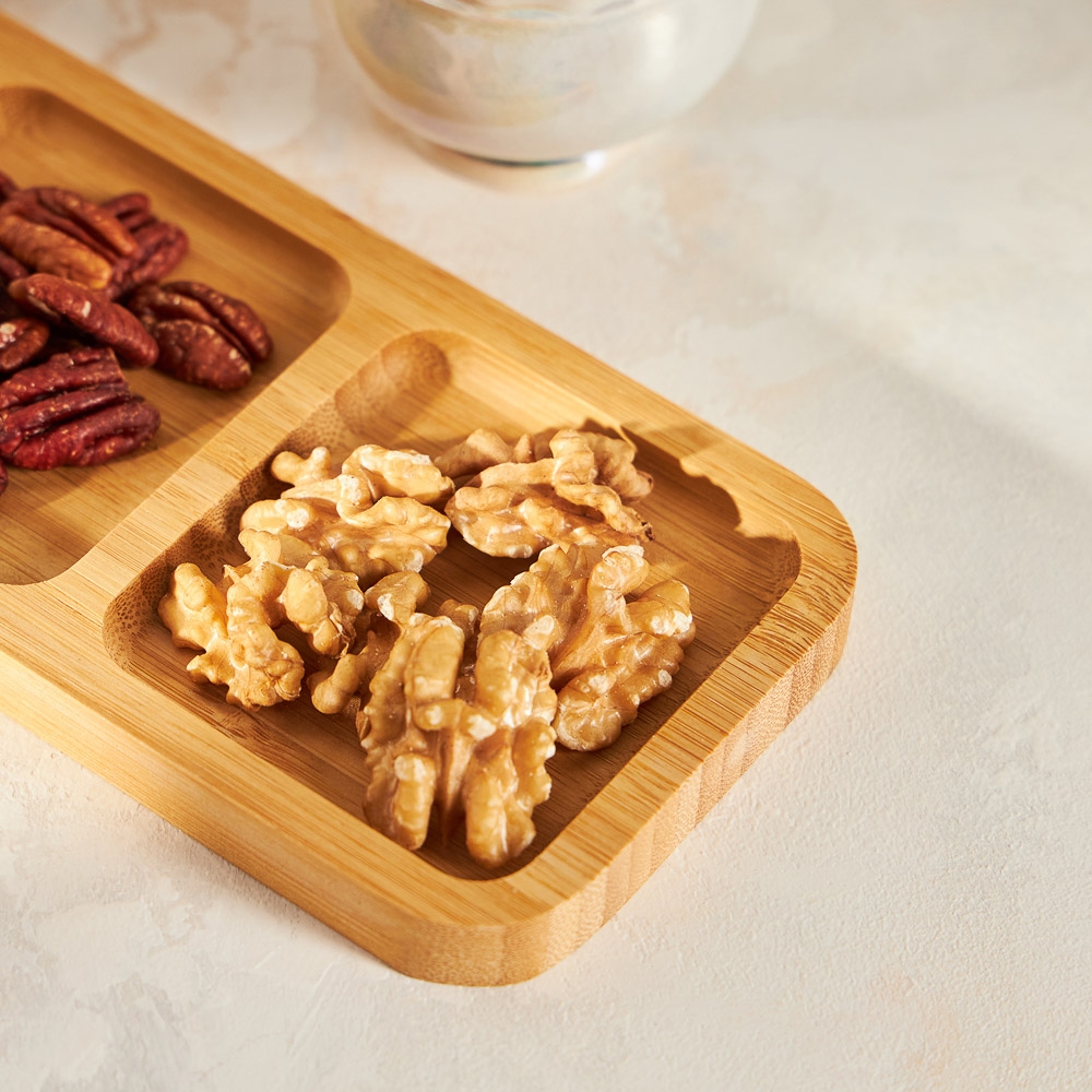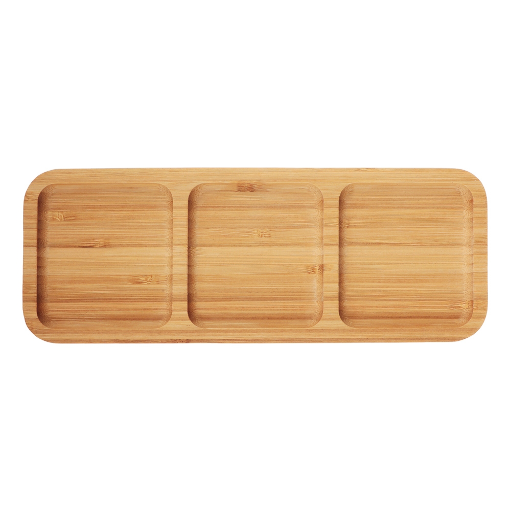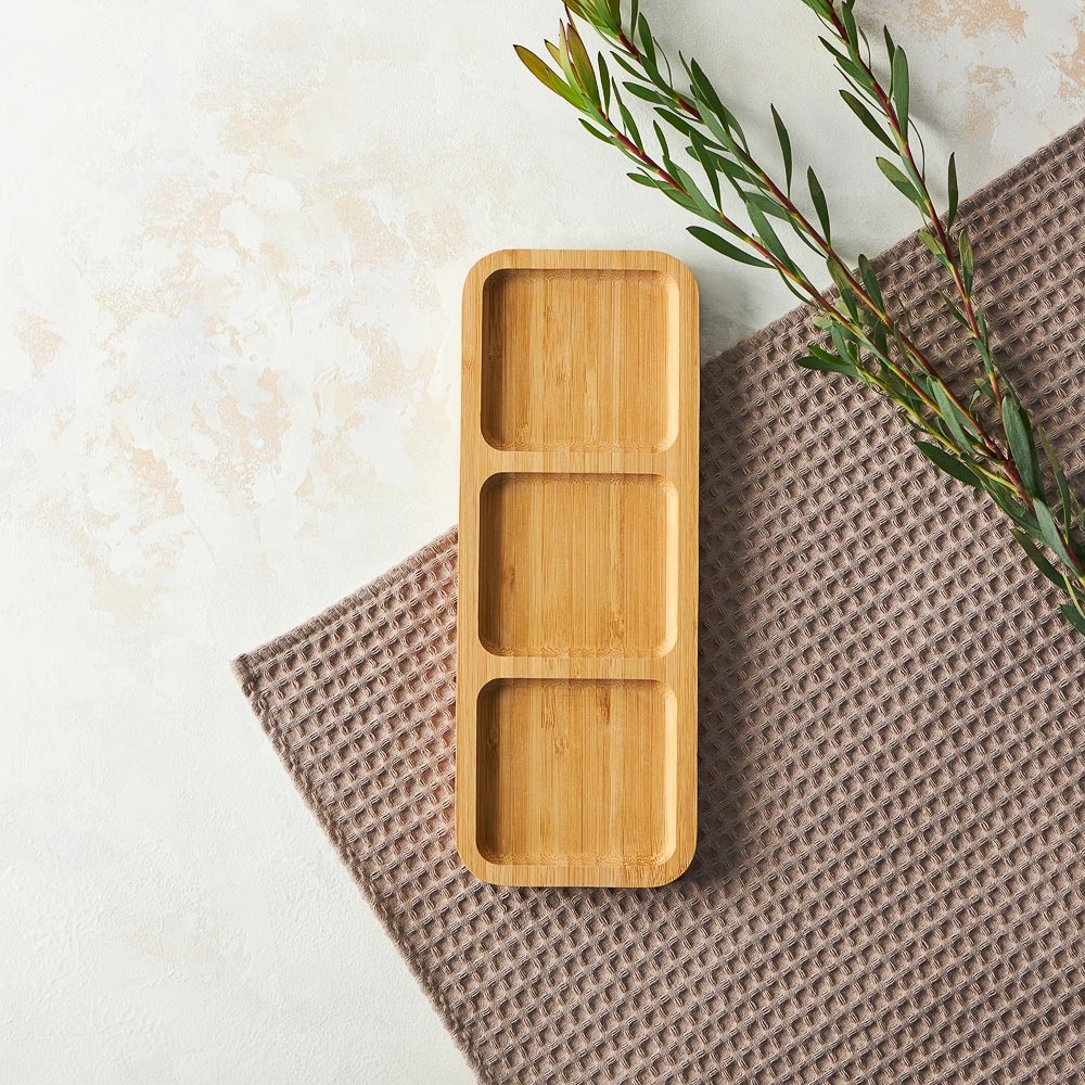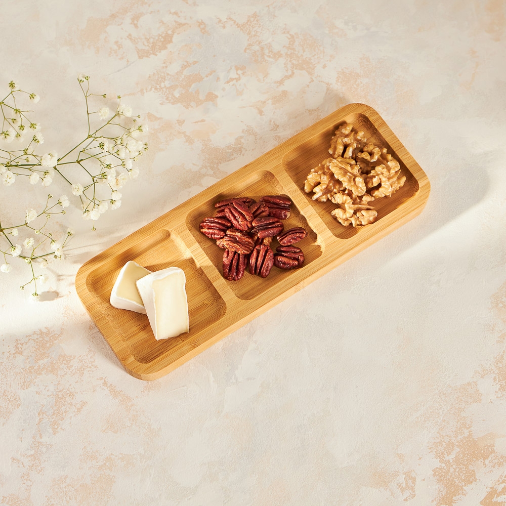 Деревянная менажница VETTA 25x9,5x1,5 см - отличный вариант для стильной сервировки стола, подачи завтрака или перекуса, например, в офис. Благодаря трем секциям на неё можно уместить несколько разных блюд, не смешивая их друг с другом. Прямоугольная, узкая форма придает менажнице элегантный и современный вид, и позволяет разместить ее на любом столе. Обратную сторону можно использовать как разделочную доску. Материал: бамбук.
