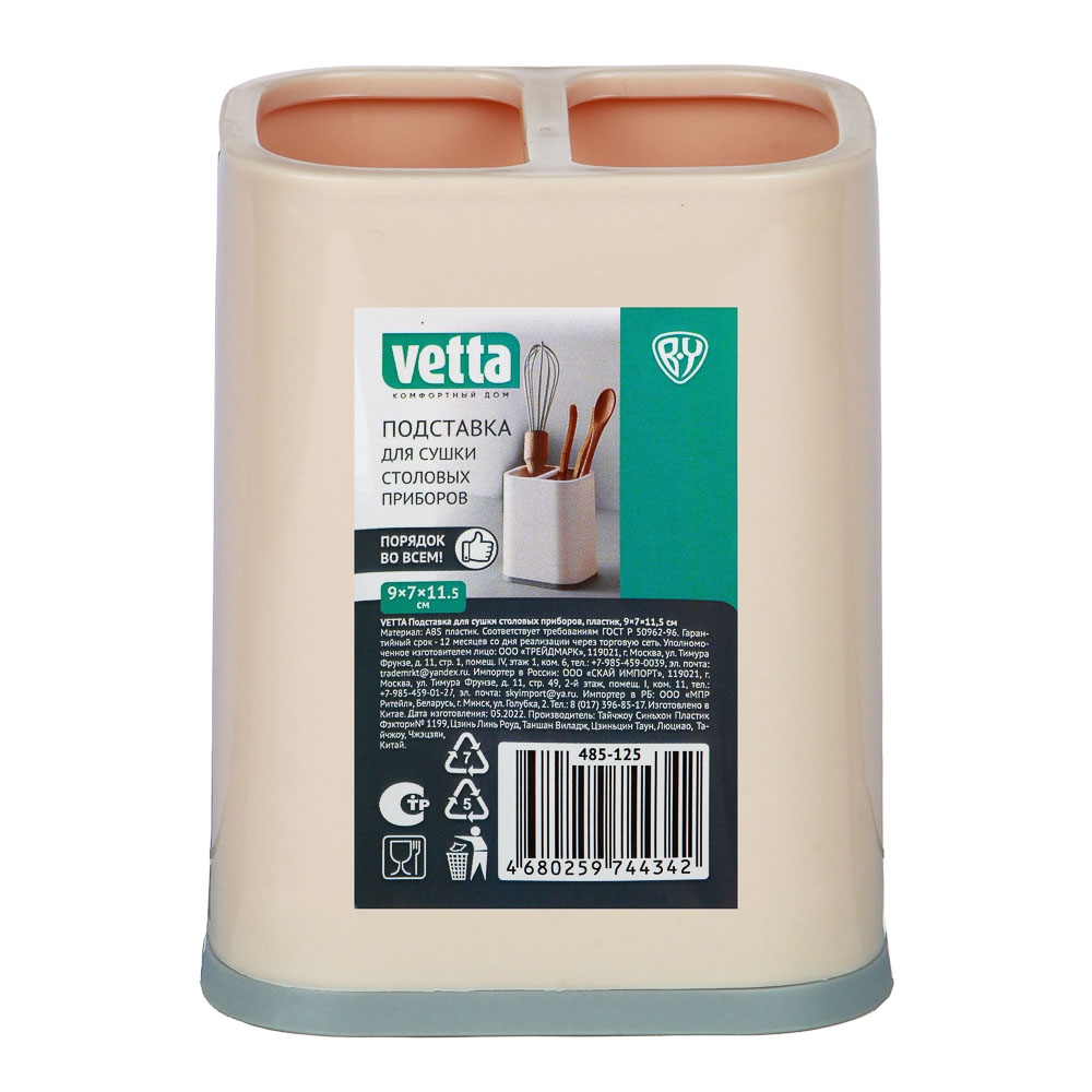 Подставка для сушки столовых приборов VETTA – это компактный стакан с двумя отсеками, который займет минимум места на кухне и поможет организовать порядок. Изделие из пластика имеет дренажные отверстия для стока воды и поддон, поэтому столовые приборы будут быстро высыхать и оставаться сухими во время нахождения в подставке. Изделие устойчивое, легко моется. Доступно 3 цвета: бежевый, серый, белый.