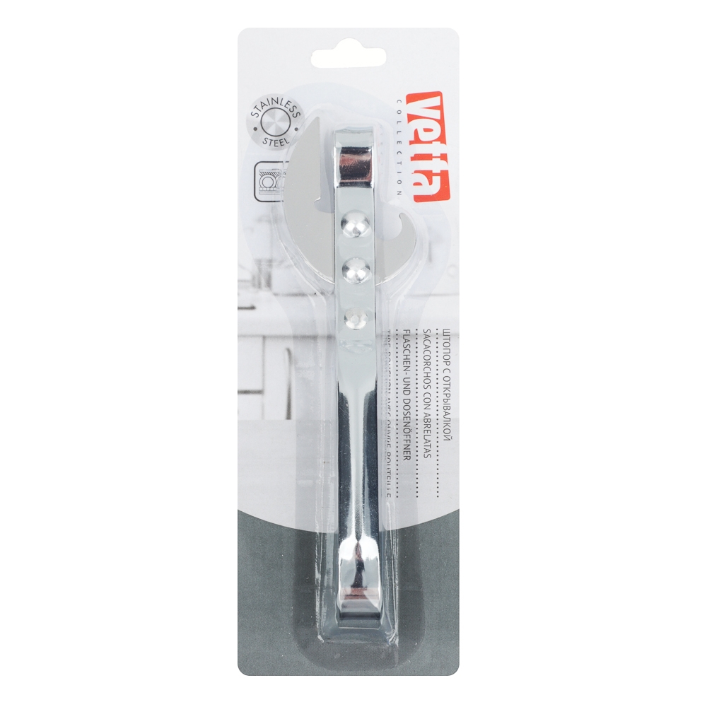 Штопор VETTA один из нужных приспособлений на кухне. Изделие 2 в 1: служит в качестве штопора и открывалки консервных банок. Простой и универсальный аксессуар. С его помощью можно открыть емкости разных типов.