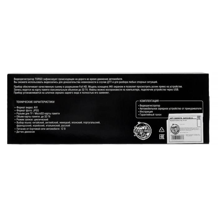 Видеорегистратор TORSO, 2 камеры, HD 1080P, размер 31х8 см, TFT 4.3, обзор 120°