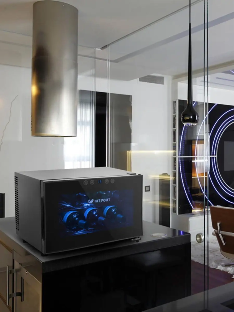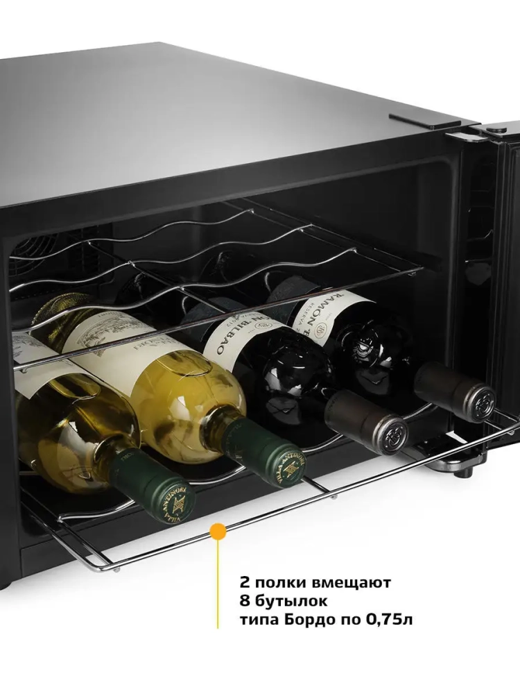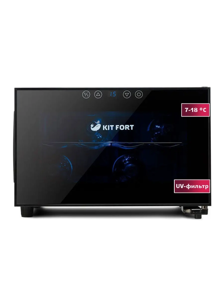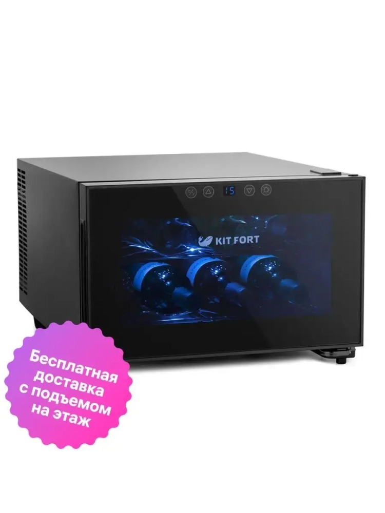 Винный шкаф Kitfort КТ-2403 — это специальная холодильная камера, в которой можно установить подходящую для хранения вина температуру. В винном шкафу две полки, на каждой полке помещается по четыре бутылки. Дверца шкафа прозрачная, в ее верхней части расположена сенсорная панель управления со светодиодным дисплеем. Охлаждение производится при помощи термоэлементов Пельтье, поэтому в конструкции винного шкафа не используются хладагенты и компрессор, из-за чего уровень шума и вибрации при работе значительно ниже, чем у холодильников.