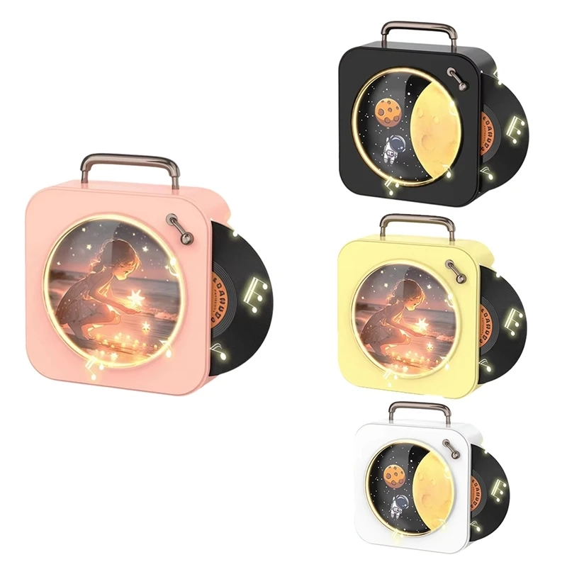 Беспроводная колонка с оригинальным дизайном создаст атмосферу музыкального винилового наслаждения в любом месте. Эта портативная мини Bluetooth 5.0 модель сочетает в себе отличное звучание и захватывающую светомузыку. Несмотря на компактный размер, передает мощные и чистые басы. Встроенные часы позволяют использовать устройство на столе в спальне или гостиной, где можно просыпаться под любимые мелодии или наслаждаться белым шумом для комфортного сна. Колонка блютуз маленькая и проигрыватель светильник выполнен в стиле ретро, оснащен уникальной LED подсветкой с питанием от аккумулятора позволяет настроить узоры освещения, двигая рычажок по пластинке, что способствует здоровому сну и глубокому расслаблению, создавая уют в доме. Проектор ночника в детской комнате поможет малышам быстро уснуть. Также это настоящий спутник для пикников и путешествий. Виниловый проигрыватель с подсветкой работает автономно до 6 часов и поддерживает зарядку от сети через USB и AUX, что обеспечивает непрерывное наслаждение музыкой. Музыкальная колонка в виде пластинки – это универсальный подарок светомузыки для людей любого возраста. Она порадует как детей и подростков, так мужчин и женщин своим качественным звучанием и захватывающими световыми эффектами. Слушайте любимые треки, наслаждайтесь динамическим светом и погружайтесь в атмосферу радости. Это лучший подарок для любимых всех возрастов!