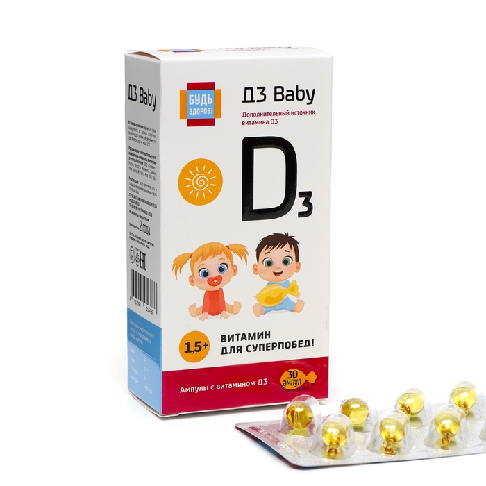 Витамин Д3 "Будь здоров!" для детей - это витаминный препарат, который содержит витамин Д3. Он упакован в удобные капсулы, всего в упаковке 30 штук.