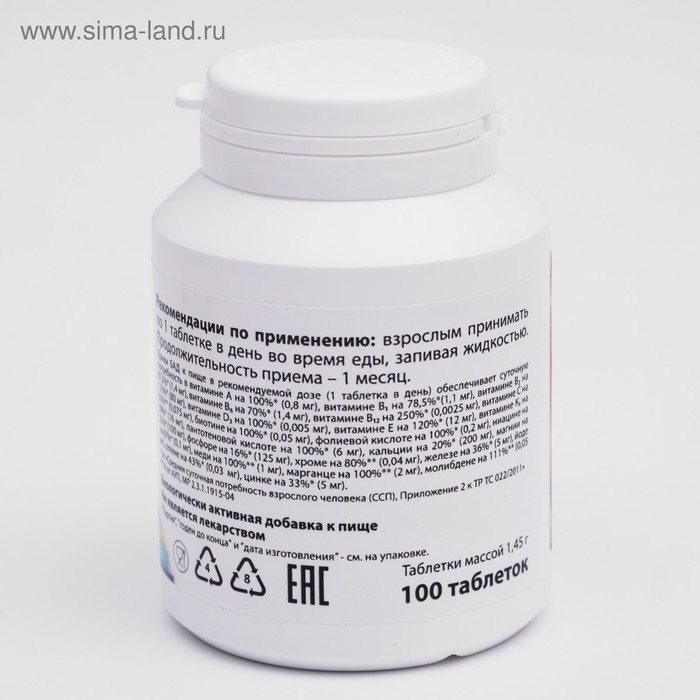 Состав: Кальция фосфат, магния оксид, кальция карбонат, L-аскорбиновая кислота (витамин С), сорбит (влагоудерживающий агент), микрокристаллическая целлюлоза (наполнитель), гидроксипропилметилцеллюлоза (наполнитель), DL-альфа-токоферола ацетат (витамин Е), ниацин, железа фумарат, магниевая соль жирной кислоты (антикомкователь), поливинилпирролидон (антикомкователь), титана диоксид (краситель), D-пантотенат кальция, оксид цинка, марганца сульфат, меди сульфат, крахмал, витамин В6, витамин В2, тальк (антикомкователь), витамин В1, витамин А, полисорбат 80 (эмульгатор), фолиевая кислота, хрома (III) хлорид, железа оксид (краситель), йодид калия, натрия молибдат, фитоменадион (витамин К1), натрия селенат, D-биотин, холекальциферол (витамин D3), витамин В12.