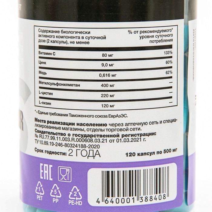 МНН/Действующее вещество: витамин С, цинк, медь, метилсульфонилметан , L-цистин, L-лизин