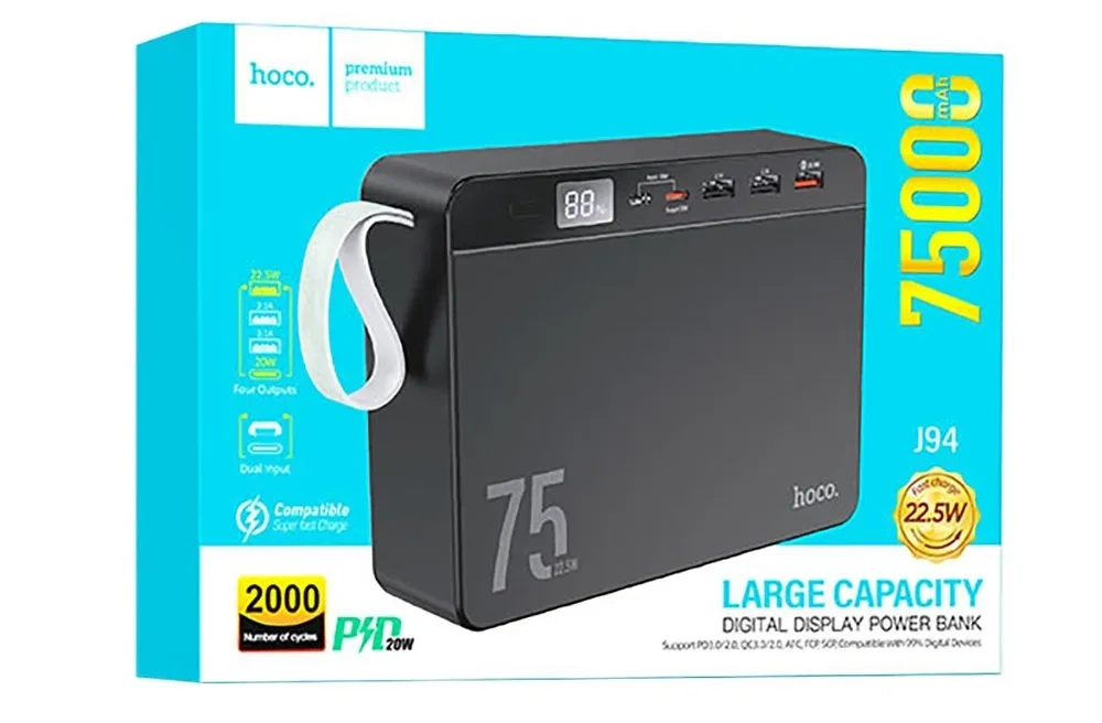 Hoco J94 Overlord 22.5W fully compatible power bank (75000mAh) - повербанк с быстрой зарядкой Qualcomm Charge 3.0, Power Delivery 3.0 и др. Заряжает большинство современных USB смарт-устройств, которые работают от встроенного аккумулятора.