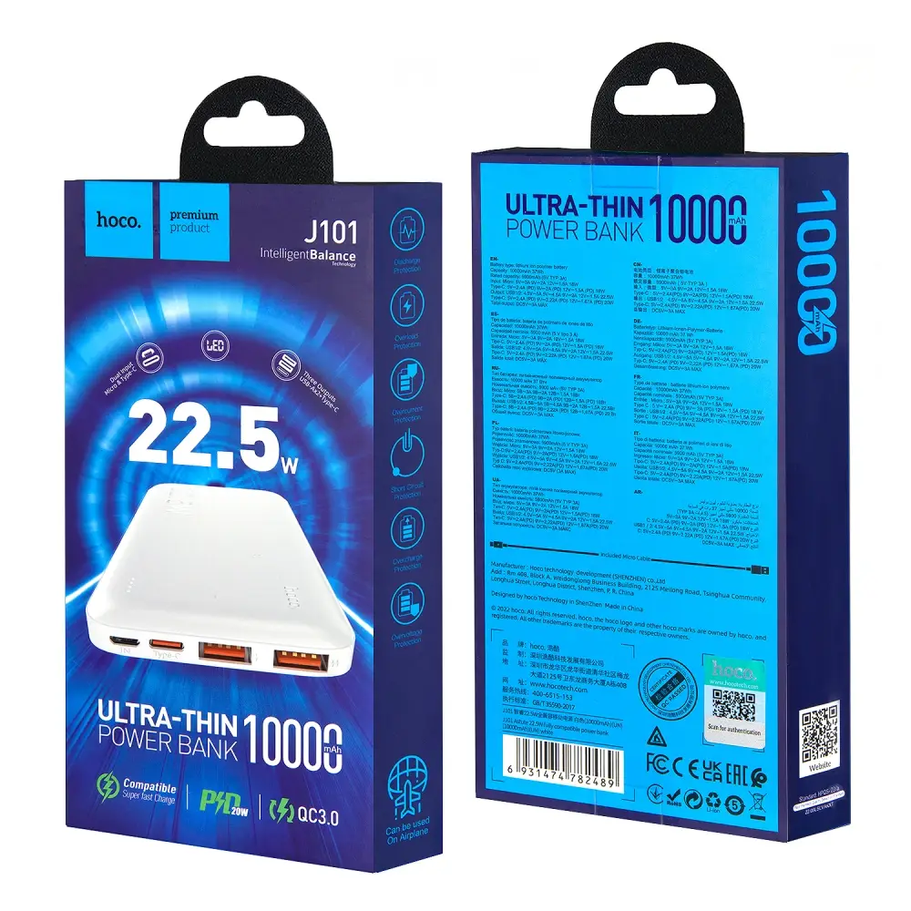 Внешний аккумулятор J101 10000 mAh 22,5WHOCO белый