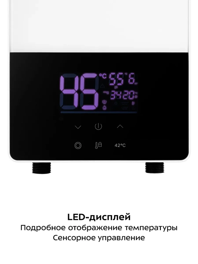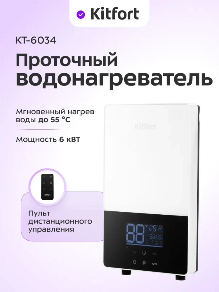 Отличительной особенностью работы проточного водонагревателя KT-6034 является постоянство температуры воды. Вы можете установить температуру воды 30–55 °C с шагом 1 °C. Но температура воды также зависит от напора: если напор слишком сильный, температура воды может быть ниже установленной. При этом, установив комфортную температуру в начале использования, вы можете не беспокоиться, что из крана пойдет кипяток или холодная вода. В комплекте с водонагревателем поставляется пульт дистанционного управления, поэтому управлять водонагревателем еще удобнее.