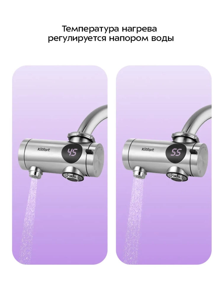 Проточный водонагреватель Kitfort KT-6523 предназначен для быстрого нагрева холодной проточной воды. Водонагреватель отличается простотой и легкостью монтажа: закрепите устройство на вашем смесителе вместо аэратора. В комплекте поставляются муфты для смесителей разного диаметра.