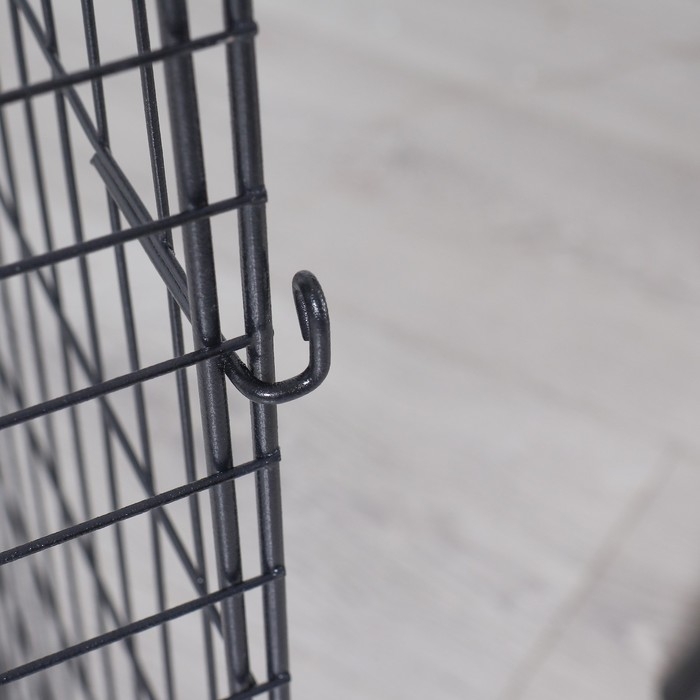 Вольер (клетка) сделан из негнущихся металлических секций, его можно быстро собрать и разобрать на открытом воздухе или в квартире без каких-либо дополнительных инструментов. Съемная конструкция складных перегородок разборного домика позволяет формировать квадратную, прямоугольную или любую неправильную форму.