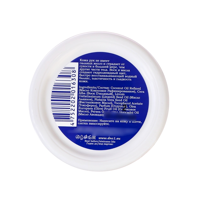 Состав: Coconut Oil Refined (Масло Кокосовое Рафинированное), Cera Alba (Воск Пчелиный), Linum Usitatissimum (Linseed) Seed Oil (Масло Льняное), Pistacia Vera Seed Oil (Фисташковое Масло), Tocopherol Acetate (Токоферол), Parfum (Отдушка), Olea Europaea (Olive) Fruit Oil (Оливковое Масло), Persea Gratissima (Avocado) Oil (Масло Авокадо).