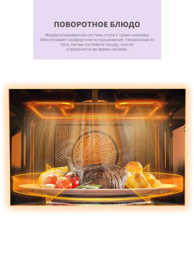 Модернизированная система поворотного стола с тремя ножками предотвратит падение блюда во время нагрева, а термостойкая дверца микроволновой печи не позволит вам обжечься. Прочные петли для крепления выдерживают вес до 30 кг и обладают невероятной прочностью, что также обеспечивает вам абсолютную безопасность при пользовании микроволновкой.