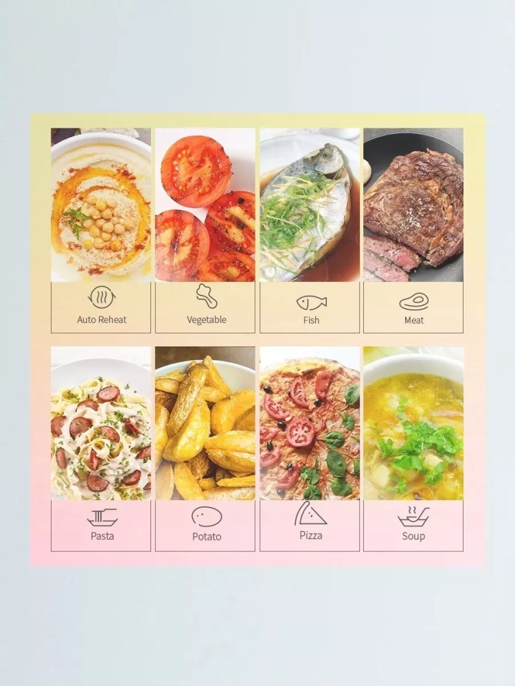 Comfee CBM200GB оснащена 8 автопрограммами, с помощью которых вы в одно касание сможете приготовить мясо, рыбу, курицу, печеные овощи или попкорн. Достаточно просто поместить продукт в камеру и выбрать нужный режим - а дальше печь позаботится обо всем сама.