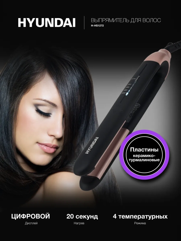 Выпрямитель Hyundai H-HS1272 40Вт черный макс.темп.:200С покрытие:керамико-турмалиновое, автоматическое отключение, настройка температуры, индикатор включения/выключения, индикатор готовности к работе, чехол, петля для подвешивания, плавающие пластины, фиксация в закрытом виде, шарнирное крепление шнура.