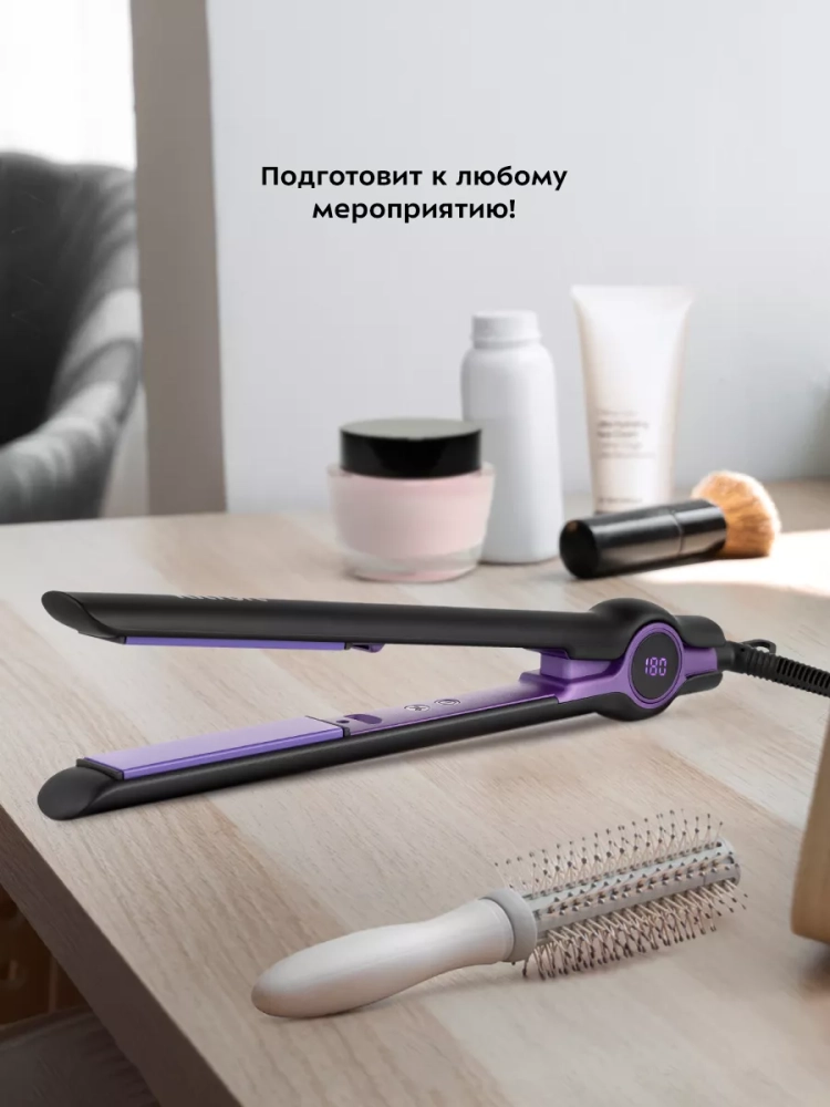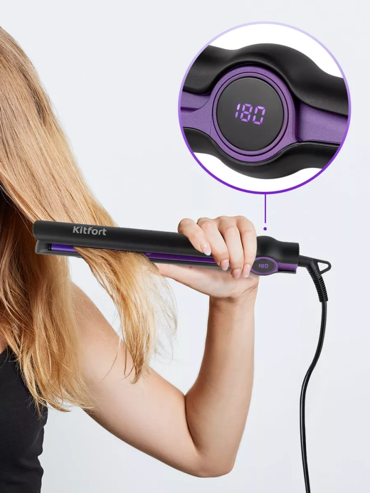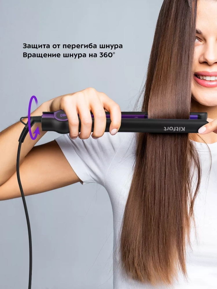 Выпрямитель для волос Kitfort KT-3267 позволит быстро выпрямить волосы и сделать красивую укладку. Керамическое покрытие нагреваемых пластин бережно выравнивает структуру волос, делая их гладкими и блестящими, а также снимает статическое электричество с волос, делая их более послушными. Температура нагрева регулирует от 160 до 220 °С с шагом 20 °С, что позволяет подобрать температуру, подходящую вашему типу волос. Наличие дисплея поможет понять, когда прибор разогреется до заданной температуры. KT-3267 прост в управлении. Кнопки включения и выключения и регулирования температуры находятся на внутренней части устройства, это поможет избежать случайного изменения настроек во время использования выпрямителя. Шнур оснащен защитой от перегиба, что увеличивает срок службы прибора. На защите от перегиба находится петля, за которую удобно повесить устройство при хранении. Вращение шнура на 360° обеспечивает удобство в использовании выпрямителя для волос — провод не наматывается и не путается при повороте устройства, а поворачивается вместе с ним. Устройство имеет функцию автоотключения через 1 час работы.