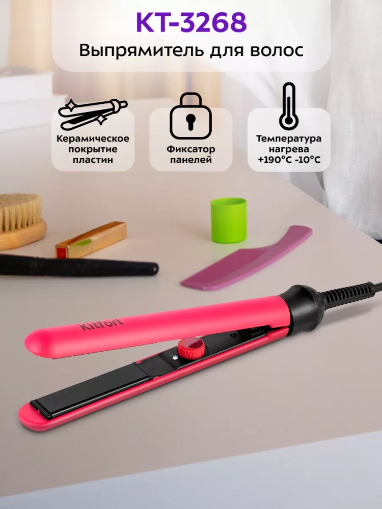 Выпрямитель для волос Kitfort KT-3268 позволит быстро выпрямить волосы и сделать красивую укладку. Керамическое покрытие нагреваемых пластин бережно выравнивает структуру волос, делая их гладкими и блестящими, а также снимает статическое электричество. Пластины нагреваются до 190±10 °С за 3 минуты. KT-3268 прост в управлении. Переключатель, с помощью которого устройство включается и включается, находится на внутренней части устройства, это помогает избежать случайного выключения во время использования выпрямителя. Прибор легкий и компактный, его удобно взять с собой в путешествие. Шнур оснащен защитой от перегиба, что увеличивает срок службы устройства.