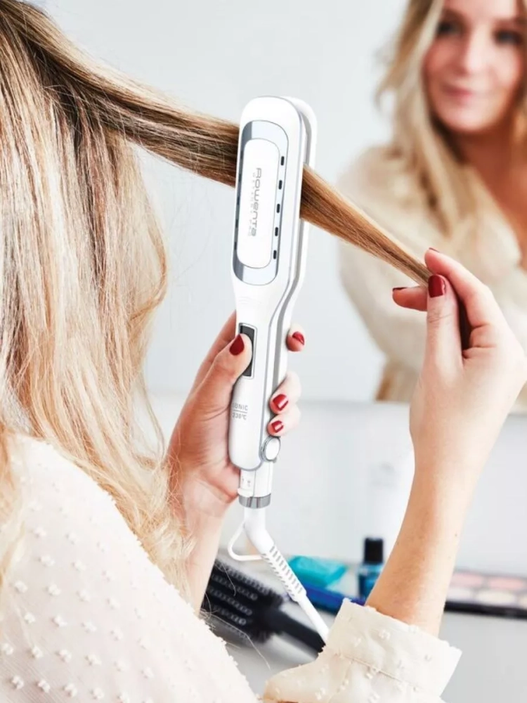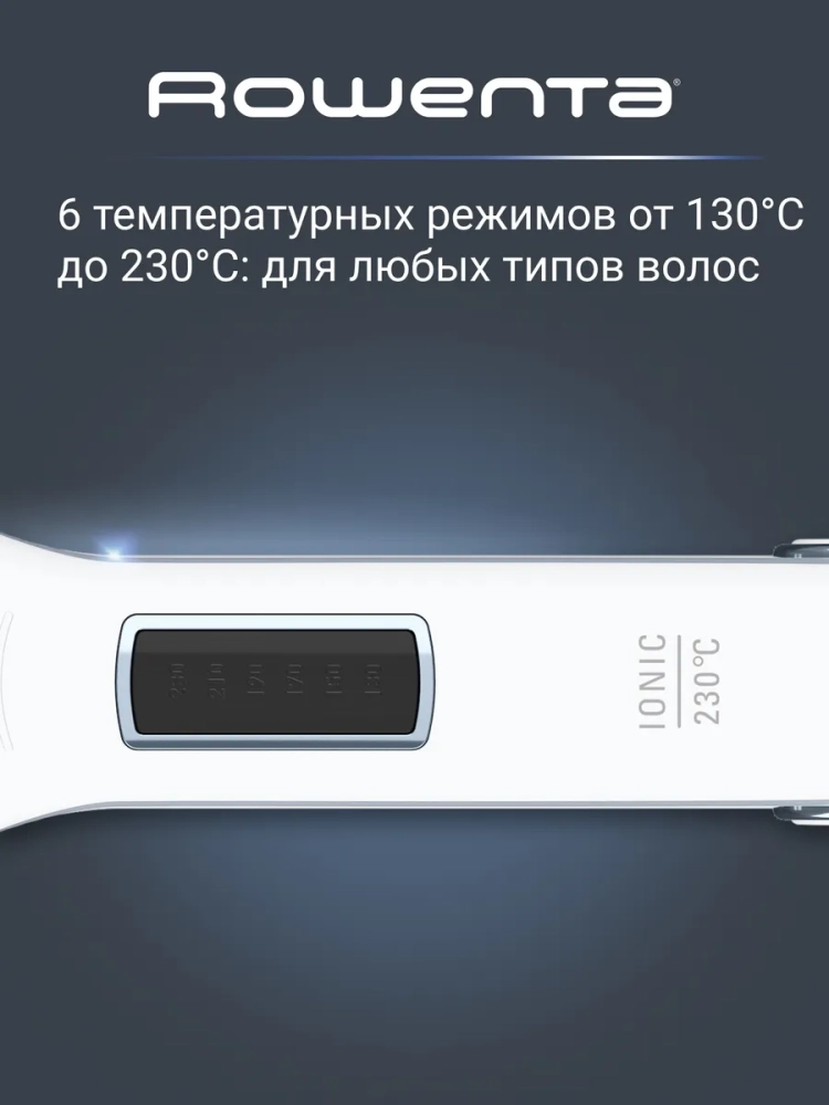 время выпрямления и делает их еще более гладкими и блестящими. Плойка для укладки гарантирует превосходные результаты как на сухих, так и на влажных прядях, а встроенный ионизатор снимет статическое электричество и разгладит ваши локоны. Благодаря широким плавающим пластинам 9 x 4,5 см устройство подойдет для использования на волосах любого типа и прибор автоматически подстроится под вашу толщину и создаст оптимальное давление для эффективного выпрямления. Кроме того, женская плойка Ровента оснащена 6 настройками температуры от 130 °C до 230 °C, с помощью которых вы сможете подобрать для себя оптимальный режим.