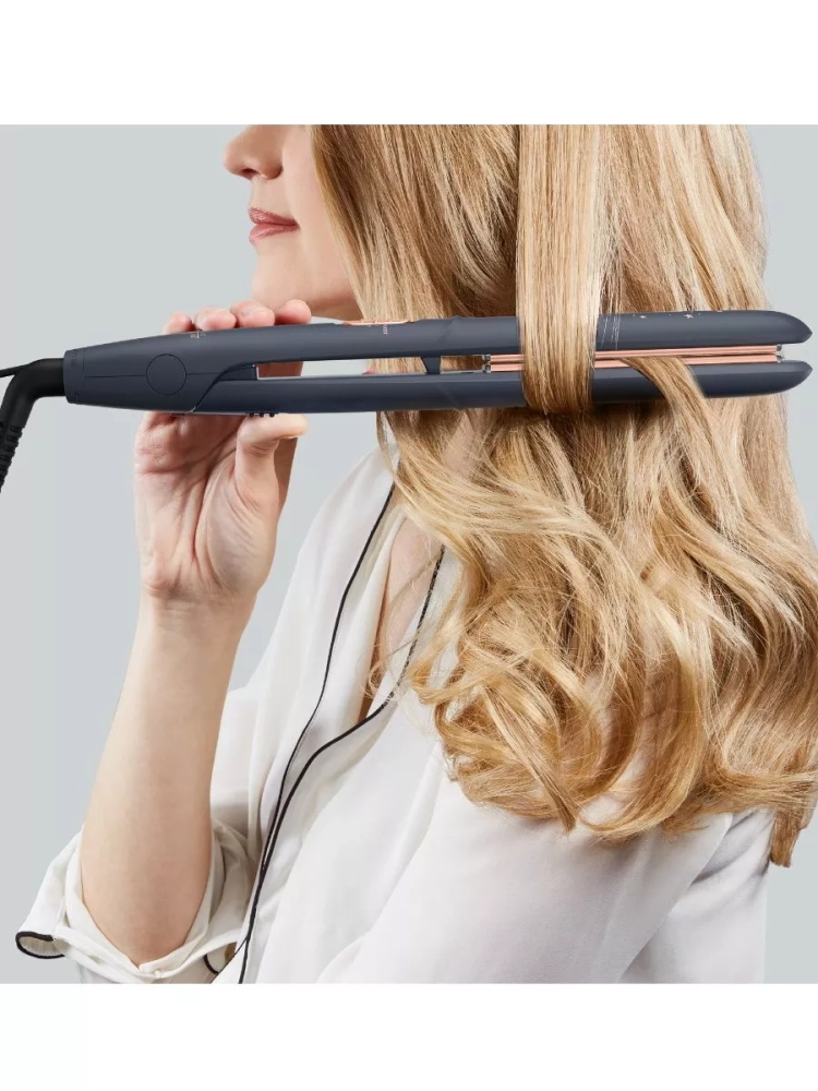 Прибор нагревается до выбранной температуры всего за 45 секунд, экономя ваше время. Плавающие пластины автоматически подстраиваются под толщину локона, делая укладку быстрее и удобнее. Керамическое турмалиновое покрытие особенно легко скользит по волосам.