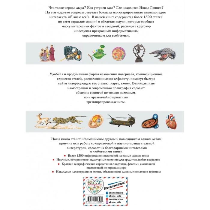 Что такое черная дыра? Как устроен глаз? Где находится Новая Гвинея? На эти и другие вопросы отвечает большая иллюстрированная энциклопедия интеллекта «Я знаю всё!». В нашей книге содержится более 1500 статей по всем отраслям знаний и областям науки, которые сообщат массу интересных фактов и сведений, расширят кругозор и послужат прекрасным информативным справочником для всей семьи. Удобная и продуманная форма изложения материала, композиционное единство статей, расположенных по алфавиту, помогут быстро найти интересующую вас статью, карту, схему. Великолепные иллюстрации и современная полиграфия сделают общение с книгой не только полезным, но и чрезвычайно приятным времяпрепровождением. Наша книга станет незаменимым другом и помощником вашим детям, приучит их к работе со справочной и научно-познавательной литературой, сделает их благодарными читателями и любителями книги.