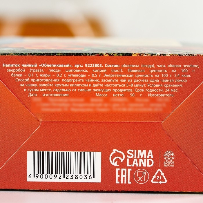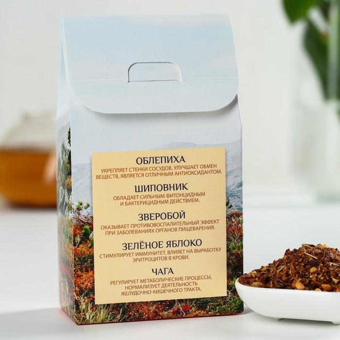 Состав: облепиха (ягода), чага, яблоко зелёное, зверобой (трава), плоды шиповника, кипрей (лист).