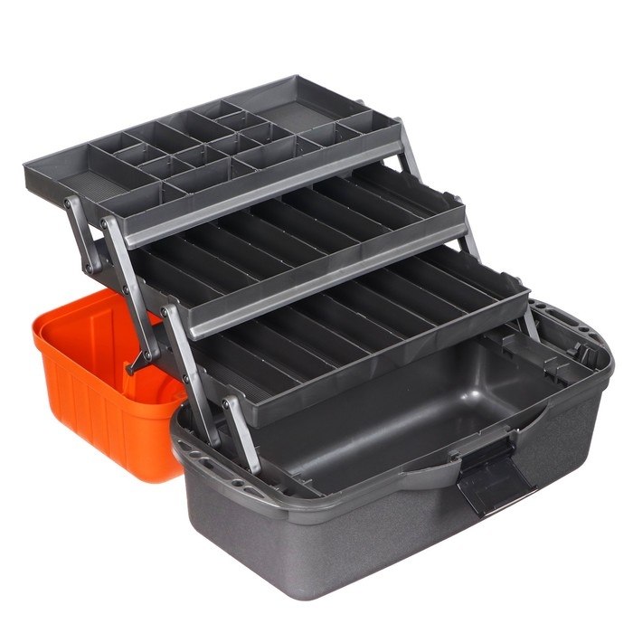 Прочный и надежный ящик для инструментов и разных бытовых мелочей позволит компактно их хранить и переносить. Три выдвижные полки с различными отсеками обеспечивают возможность хранения множества мелочей: болты, шайбы, шурупы, сверла и т.д. Материал ящика: ударопрочный и морозостойкий пластик. Преимущество пластика в том, что ящик имеет небольшой вес (1,47 кг). Морозоустойчивый пластик позволит защитить находящийся внутри инструмент от значительных перепадов температур.