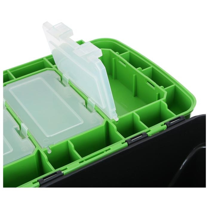 - Три прозрачных бокса для мелких снастей на внутренней стороне крышки ящика.