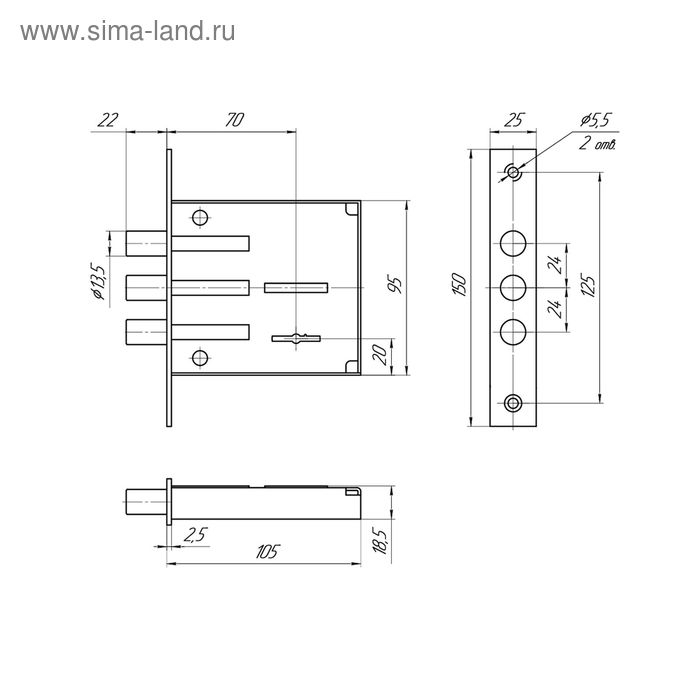 Врезной замок предназначен для установки вкладным способом. Модель обладает 3 цилиндрическими ригелями диаметром 13,5 мм с максимальным вылетом 22 мм.