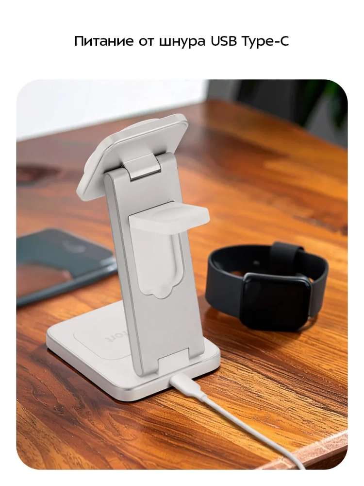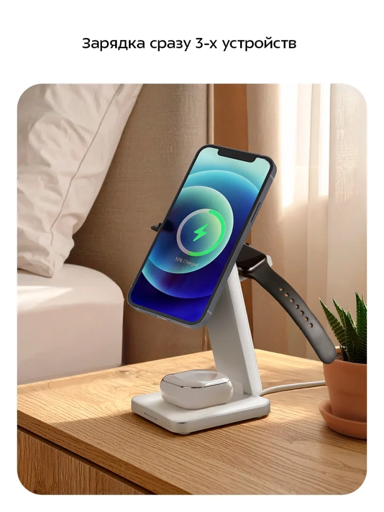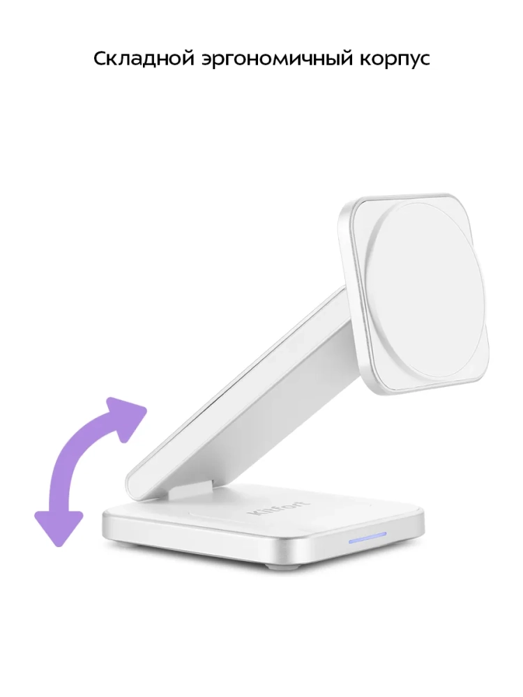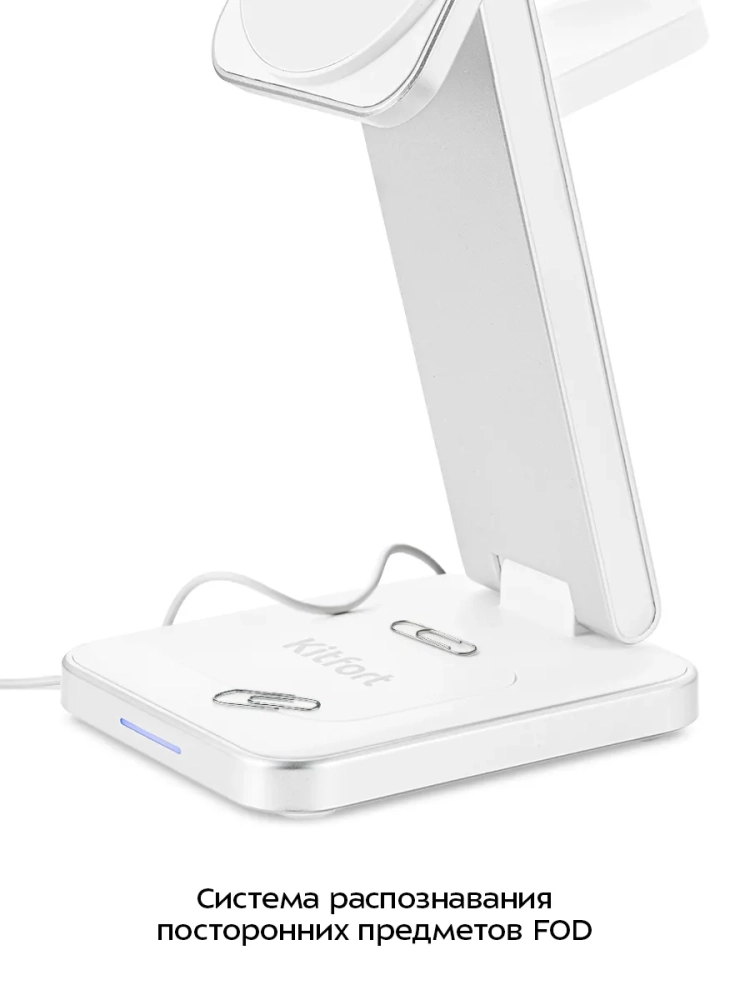 Зарядная станция KT-3755 позволяет заряжать 3 устройства одновременно. Подставка для телефона предназначена для зарядки смартфонов, подставка для часов — для зарядки Apple Watch (Series 3, 4, 5, 6, 7, 8, 9, SE, Ultra, Ultra 2), а область беспроводной зарядки наушников позволяет заряжать наушники и любые другие устройства, поддерживающие беспроводную зарядку Qi. В подставку для телефона встроено магнитное кольцо, которое может удерживать iPhone 12 и более новые модели, т. к. в данных моделях смартфонов также встроено кольцо, которое обеспечивает надежное крепление к магнитному кольцу в подставке для телефона. Однако есть специальные магнитные кольца, которые приклеиваются к корпусу смартфона, или чехлы с магнитным кольцом внутри для более старых моделей. Положение подставки для телефона регулируется: вы можете расположить ее горизонтально или под наклоном. В положении под наклоном можно закрепить смартфон на магнитное кольцо для зарядки и продолжать им пользоваться. Cмартфоны без возможности крепления на магнитное кольцо можно заряжать при помощи области беспроводной зарядки для наушников.