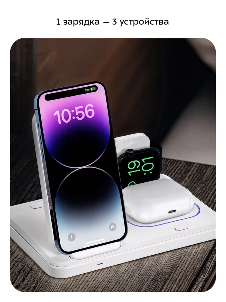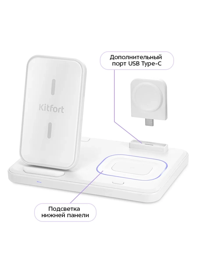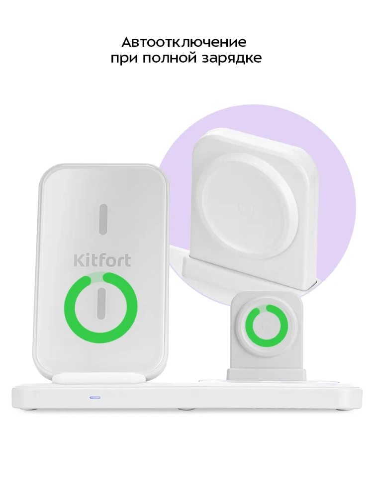 Зарядная станция Kitfort КТ-3756 позволяет с легкостью заряжать телефон, часы и наушники или другие устройства, если они поддерживают функцию беспроводной зарядки. Устройство работает по стандарту Qi для индукционной передачи энергии. Многие современные смартфоны и умные часы поддерживают стандарт беспроводной зарядки Qi.
