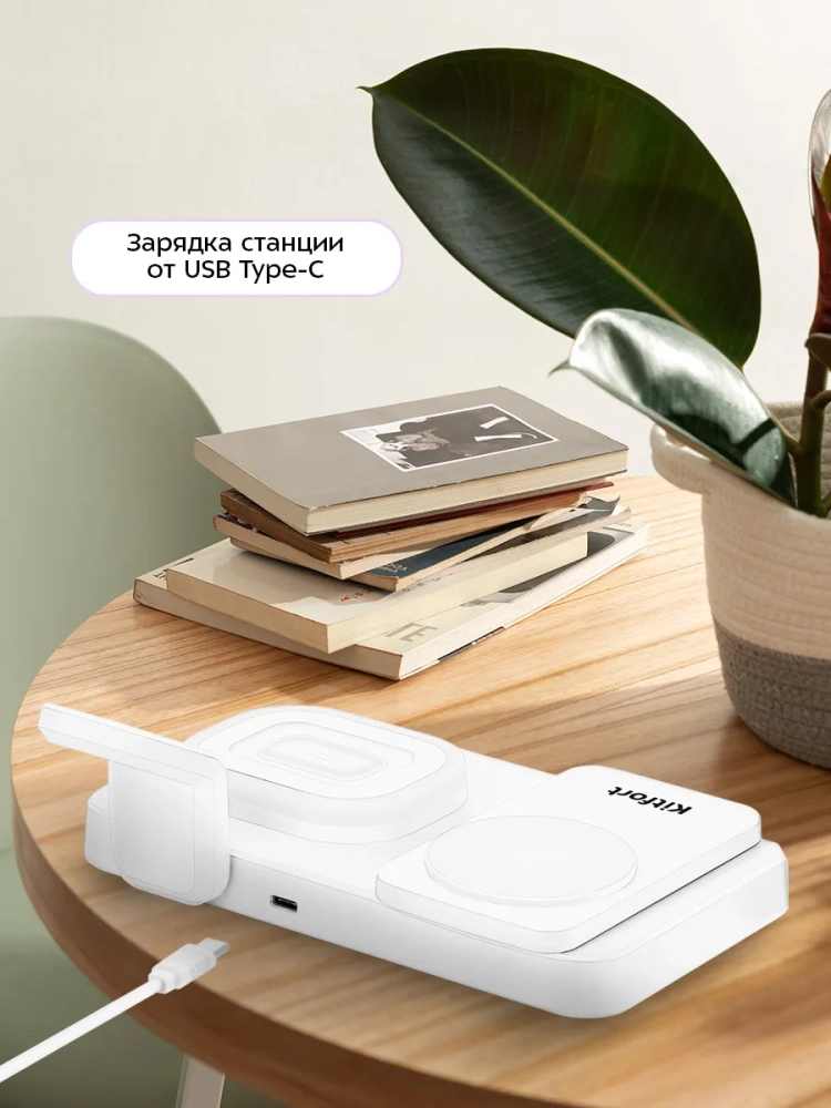 Зарядная станция Kitfort КТ-3760 позволяет с легкостью заряжать телефон, часы и наушники или другие устройства, если они поддерживают функцию беспроводной зарядки. Устройство работает по стандарту Qi для индукционной передачи энергии. Многие современные смартфоны и умные часы поддерживают стандарт беспроводной зарядки Qi.