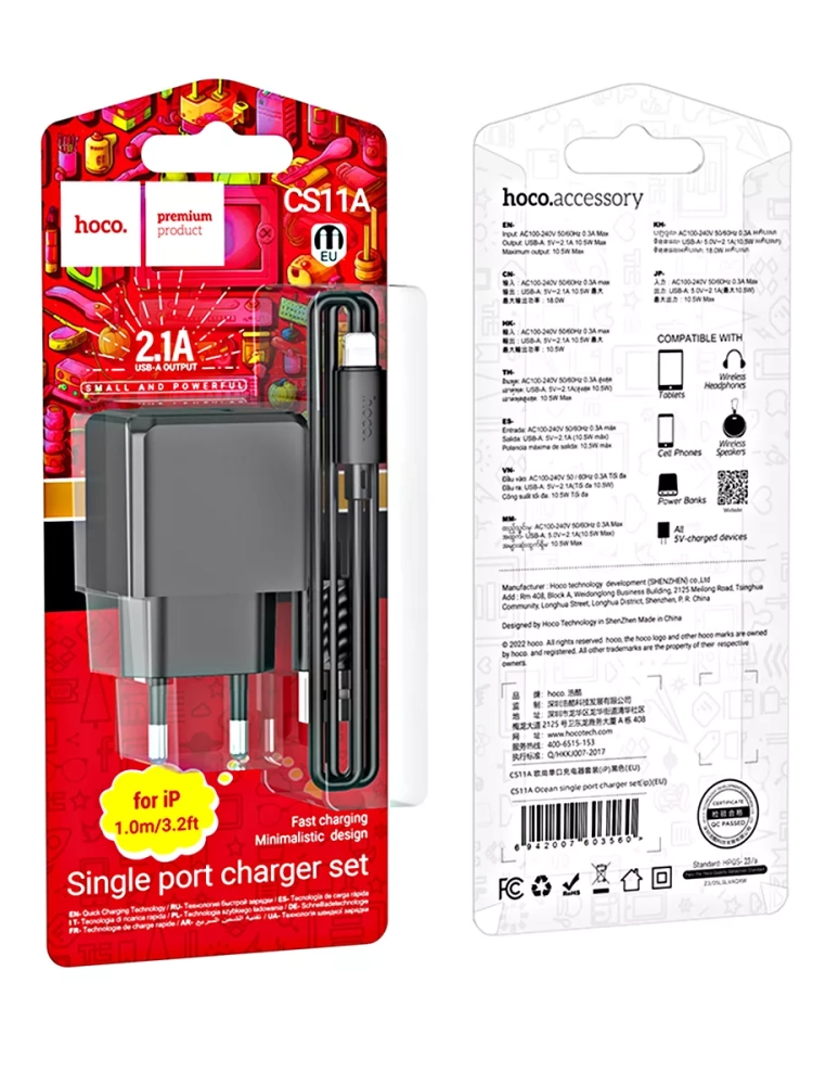 Hoco CS11A Ocean, зарядное устройство с одним USB-A 5V / 2.1A портом, набор с кабелем 1м USB-A на Lightning.