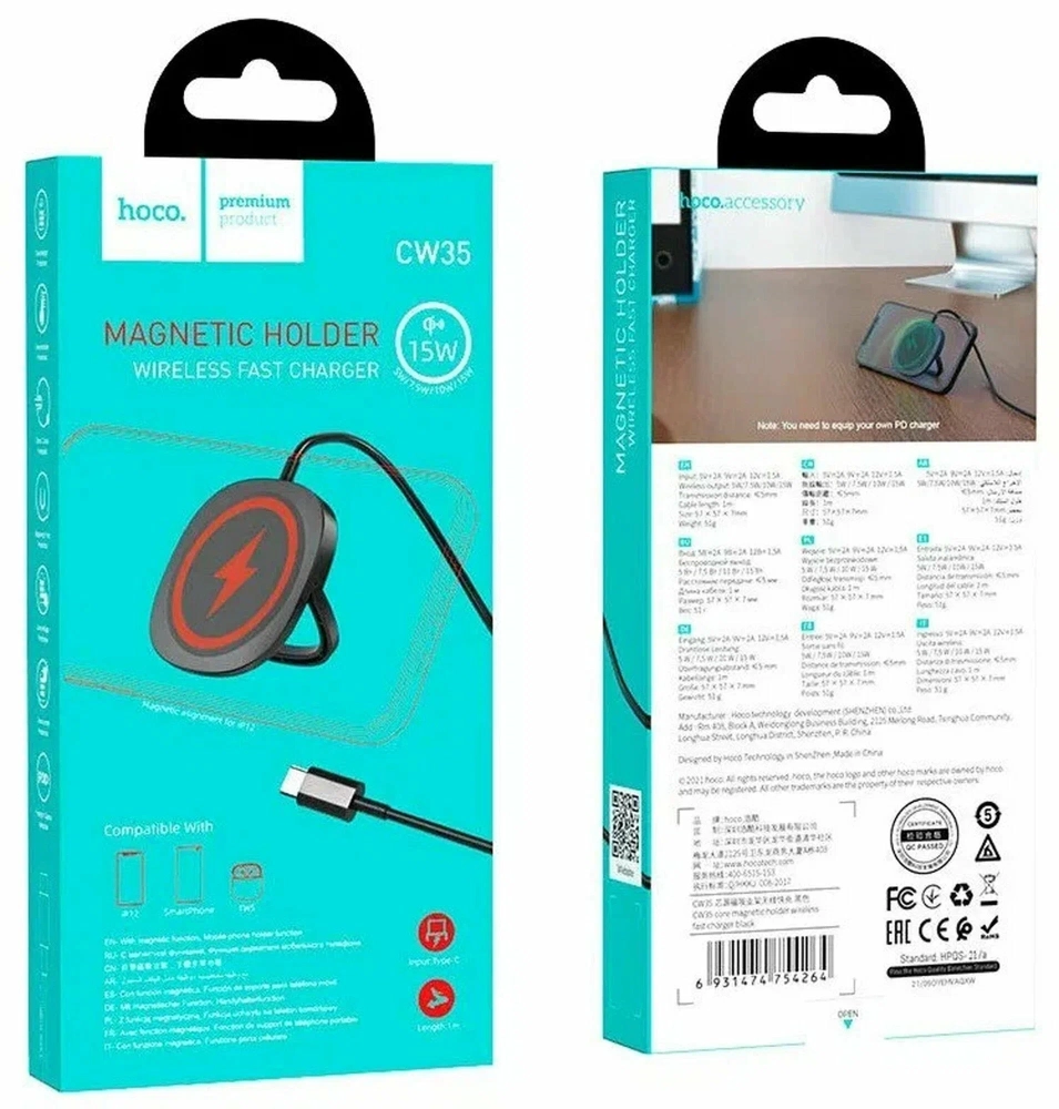 Легкая, тонкая и компактная беспроводная зарядка-подставка Hoco CW35 Core закрепляется прямо на корпус смартфона и заряжает его по беспроводной технологии QI с выходной мощностью до 15 Вт. Зарядное подходит для смартфонов Apple со встроенными магнитами MagSafe. Во время зарядки телефоном можно пользоваться, не снимая его с зарядного и не снижая скорость зарядки. В торцевой части корпуса спрятан упор, который можно выдвинуть, чтобы разместить гаджет на ровной поверхности под удобным углом обзора. Этот аксессуар совместим с мобильными аппаратами, имеющими встроенную функцию беспроводной зарядки. Проверьте наличие этой функции на Вашем смартфоне. В ином случае требуется дополнительный ресивер. Преимущества быстрой беспроводной зарядки-подставки для телефона 15W Hoco CW35 Core - Черная Для ряда телефонов Hoco CW35 Core имеет возможность ускоренной зарядки, обеспечивающей на 40% большую скорость заряда. Работает только с моделями, поддерживающими такую функцию. В остальных случаях обеспечивается стандартная скорость беспроводной зарядки. Для быстрой зарядки следует использовать соответствующие адаптеры питания (Quick Charge). Корпус зарядного сделан из износостойкого алюминиевого сплава. Благодаря использованию качественных материалов, зарядное получилось крепким, надежным и устойчивым к коррозии. Весит оно 51 грамм, а толщина его всего 7 мм. В торцевой части зарядного спрятана опорная нога. Если ее выдвинуть, то зарядка превращается в подставку для смартфона. Это позволит вам установить телефон в удобном положении для разговоров по видеосвязи, просмотра входящих сообщений или для просмотра фильмов. Благодаря встроенным магнитам, Hoco CW35 Core фиксируется на смартфоне. Для этого в телефоне должны быть размещены специальные контакты MаgSafе. С другими моделями мобильных устройств зарядное будет работать как обычная беспроводная зарядка без фиксации на корпусе. Перед началом использования зарядку-подставку необходимо подключить к сети. Зарядное поддерживает четыре режима: 5 Вт, 7.5 Вт, 10 Вт и 15 Вт. Для каждого мобильного устройства определяется оптимальная мощность, при которой зарядка будет происходить быстро и безопасно. Hoco CW35 Core оснащено многоуровневой системой защит, поэтому заряжаемое устройство меньше подвержено перепадам тока и напряжения.