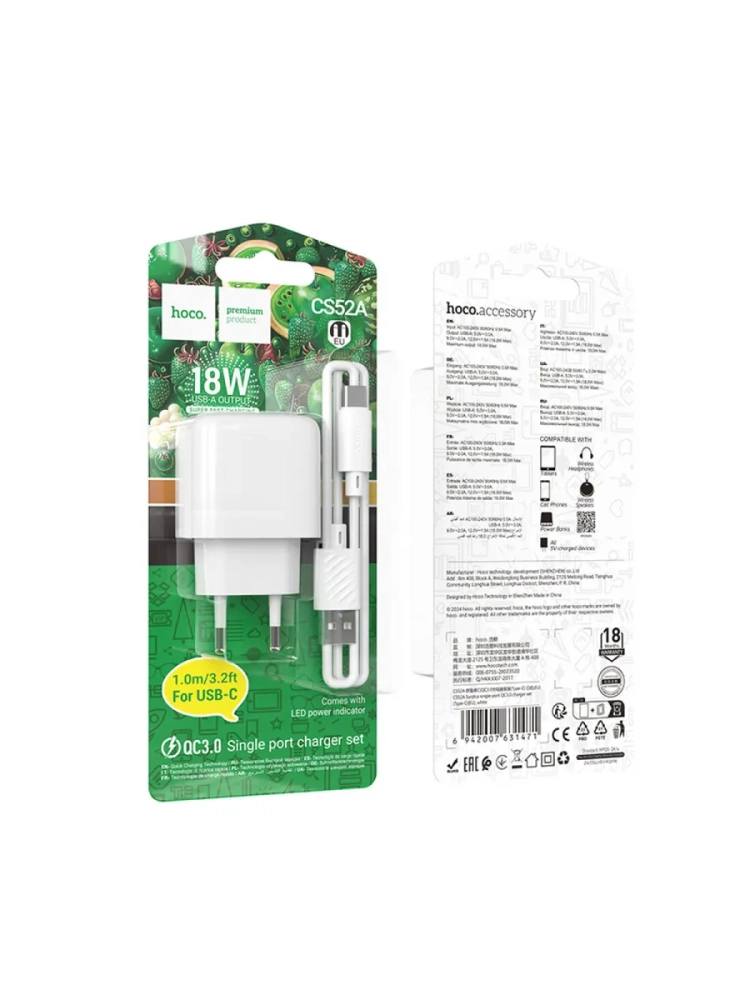Сетевое зарядное устройство Hoco CS52A — это компактный и удобный аксессуар, предназначенный для зарядки различных электронных устройств. Оно оснащено одним USB-портом с поддержкой технологии быстрой зарядки QC (Quick Charge), что позволяет быстро заряжать совместимые устройства. Основные характеристики: Материал корпуса: ABS-пластик. Это прочный и долговечный материал, который обеспечивает надёжную защиту внутренних компонентов зарядного устройства от повреждений. Мощность: 18 Вт. Зарядное устройство поддерживает технологию быстрой зарядки QC / FCP / AFC, что позволяет ускорить процесс зарядки совместимых устройств. Разъём: EU (европейский стандарт). Это означает, что зарядное устройство предназначено для использования в странах Европы и может работать от стандартных европейских розеток.