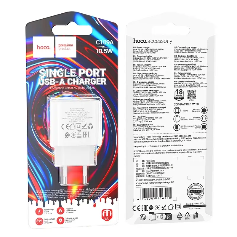 Сетевое зарядное устройство HOCO C109A — это компактное и лёгкое устройство, предназначенное для зарядки различных гаджетов через порт PD 20W. Оно выполнено из прочного и надёжного материала ABS, который обеспечивает долговечность и устойчивость к повреждениям.