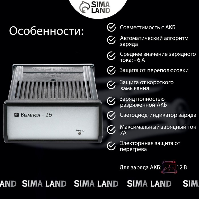 Зарядно-предпусковое устройство АКБ Вымпел-15, 7 А, 12 В, до 100 Ач, 12 В
