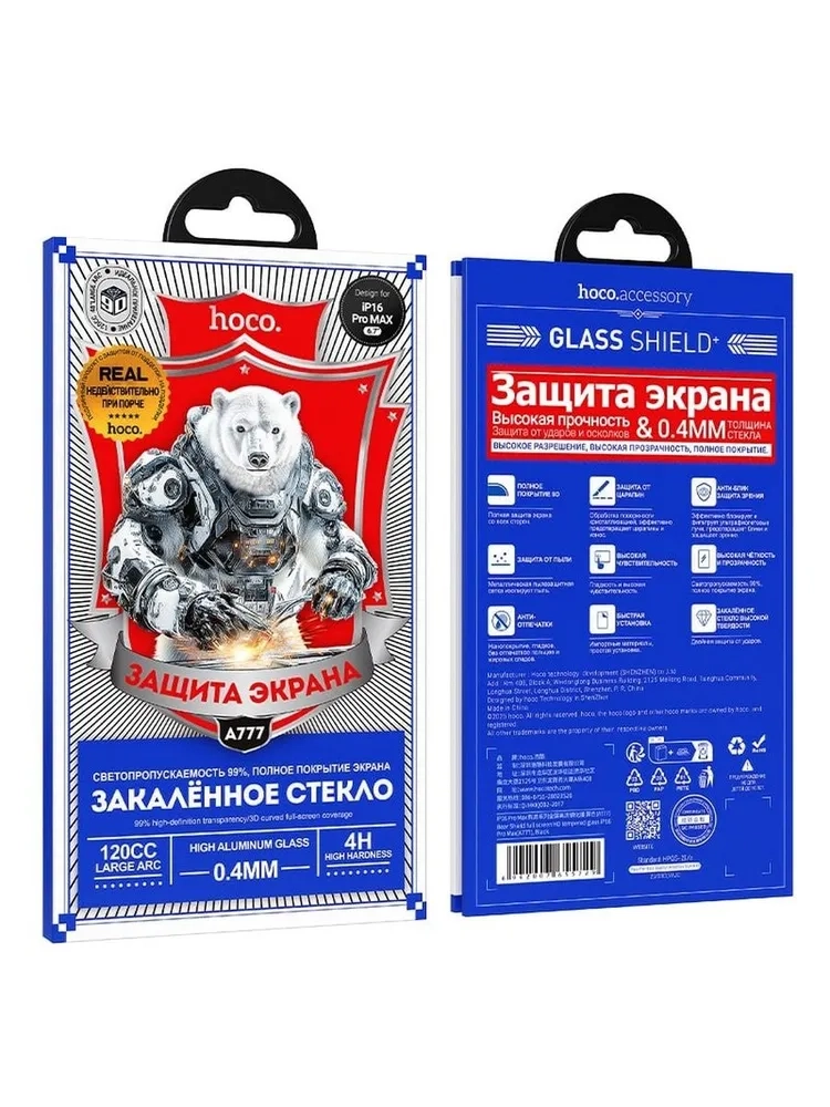 Противоударное защитное стекло HOCO 9D A777 предназначено для защиты экрана смартфонов iPhone 16 PRO MAX Полноэкранное прозрачное 9D стекло имеет небольшие изгибы по краям и качественное олеофобное покрытие, что дает максимально приятные тактильные ощущения при использовании смартфона. Антибликовое покрытие позволит комфортно пользоваться гаджетом даже при самом ярком солнце. Стекло не влияет на работу сенсорного дисплея и ложится на поверхность, не образуя пузырьков. Защитное стекло адаптировано под любые чехлы и бамперы. Высокое качество средства и прочность материалов позволяют защитить экран не только от царапин и трещин, но и при падении, ударах о твердые поверхности с небольшой высоты. Закаленное стекло не матовое, не антишпион. Стекло имеет прочность 9H, очень прочное и тонкое (толщина составляет 0.4 мм), что делает его использование незаметным. По периметру аксессуара есть объемная черная рамка, не уменьшающая размер родного экрана. Покрытие глянцевое. Бронь поверхность хорошо откликается на прикосновения. Технология нанесения клея по всей поверхности позволяет установить износостойкое бронированное стекло самостоятельно в домашних условиях. Не нужно быть профессионалом по наклейке гибкого стекла для мобильных телефонов, потому что в комплекте есть всё необходимое для быстрой и удобной установки. Изделие поставляется в плотной упаковке, что исключает повреждения во время транспортировки. В комплект входит: защитное бронестекло на жесткой подложке, тряпочка из микрофибры: влажная салфетка для стекол, а также стикеры (наклейка) для удаления пыли. Противоударное оригинальное защитное стекло HOCO лучшее качество, проверенное временем!