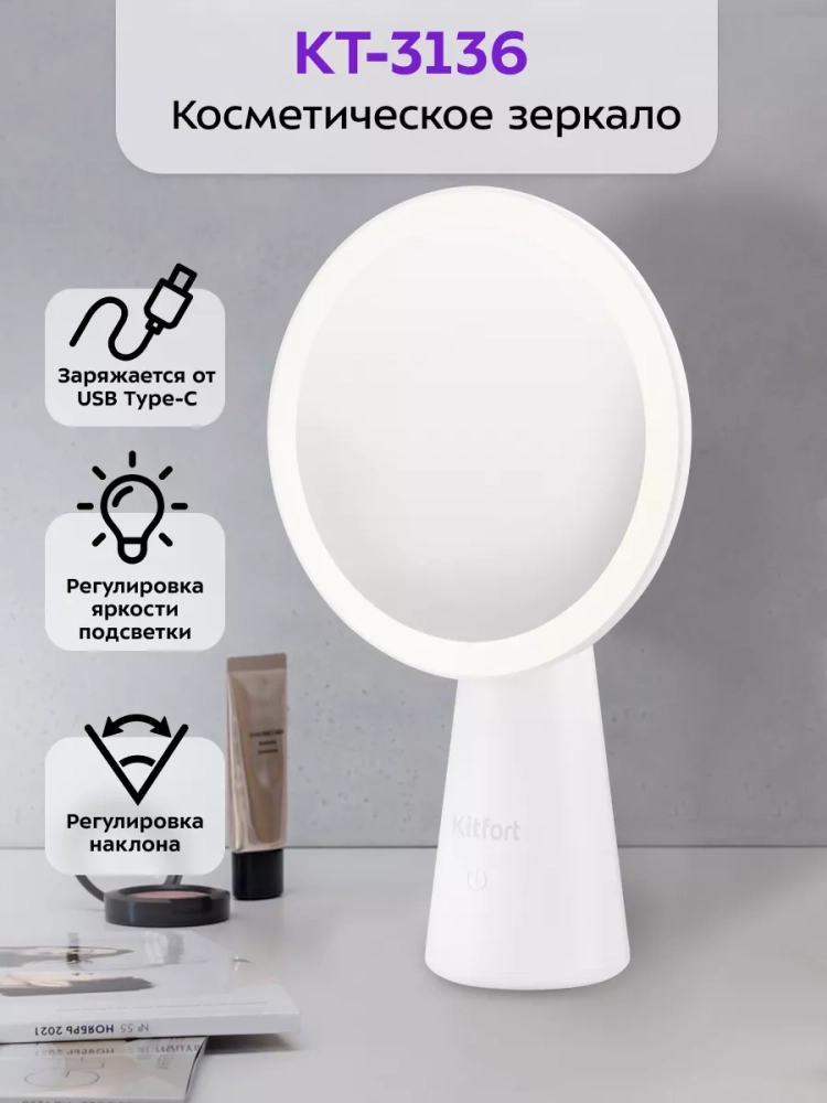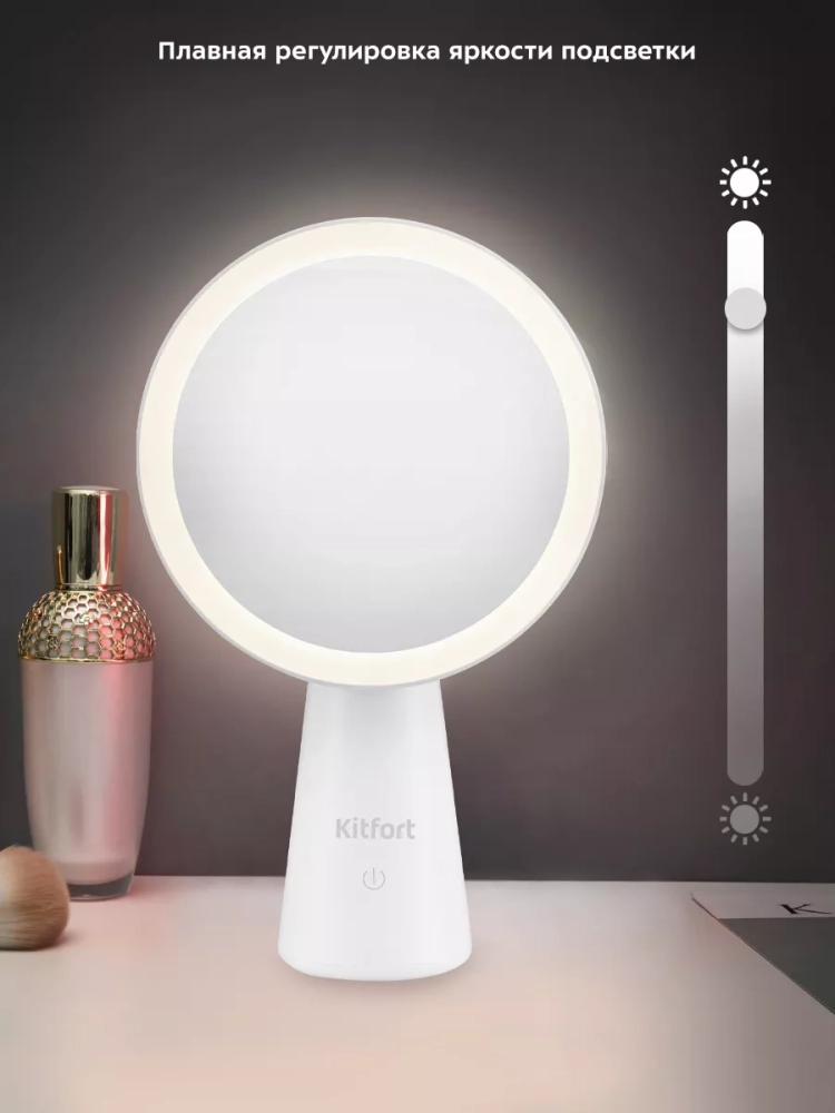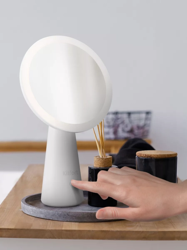 С косметическим зеркалом Kitfort KT-3136 нанесение макияжа и проведение косметических процедур станет удобнее. Зеркало устанавливается на стол. Вы можете отрегулировать угол наклона зеркальной поверхности. Контурная подсветка зеркала поможет лучше разглядеть все мелкие детали даже в условиях недостаточного освещения в помещении. Подсветку можно отключить или настроить яркость.