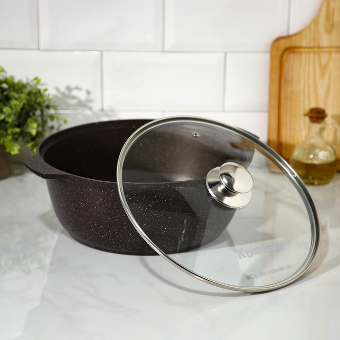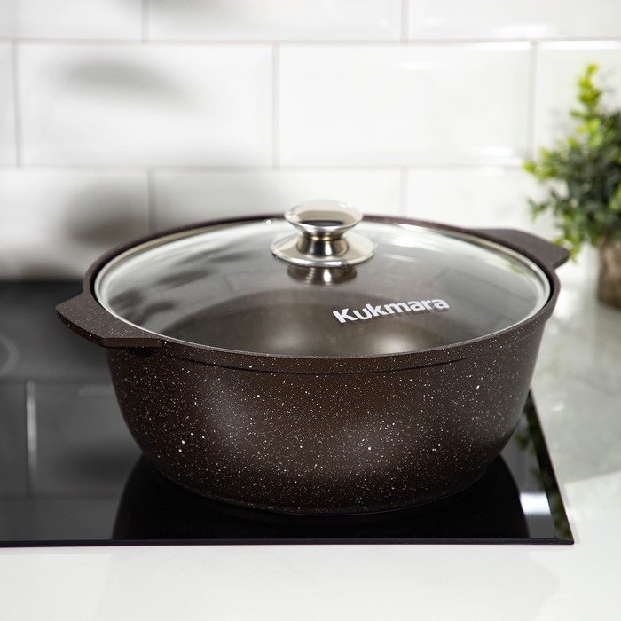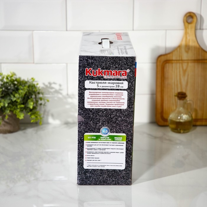 Жаровня Kukmara сделана из литого алюминия. Имеет инновационное антипригарное мраморное покрытие на водной основе, которое изготовлено по немецкой технологии (Weilburger Coatings GmbH) и усилено сверхтвёрдыми частицами минералов.