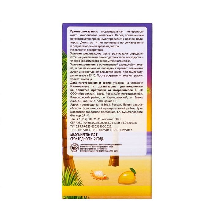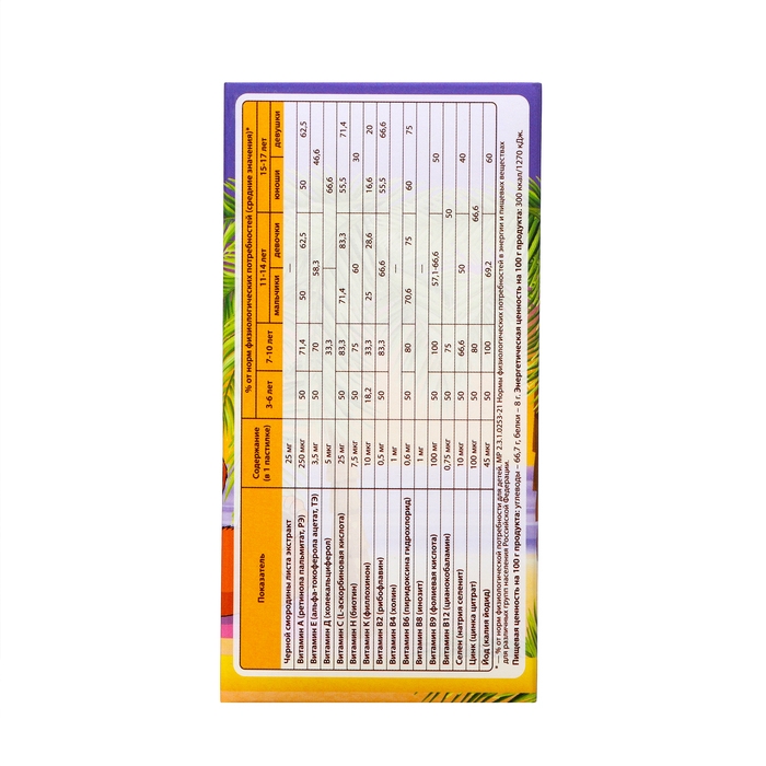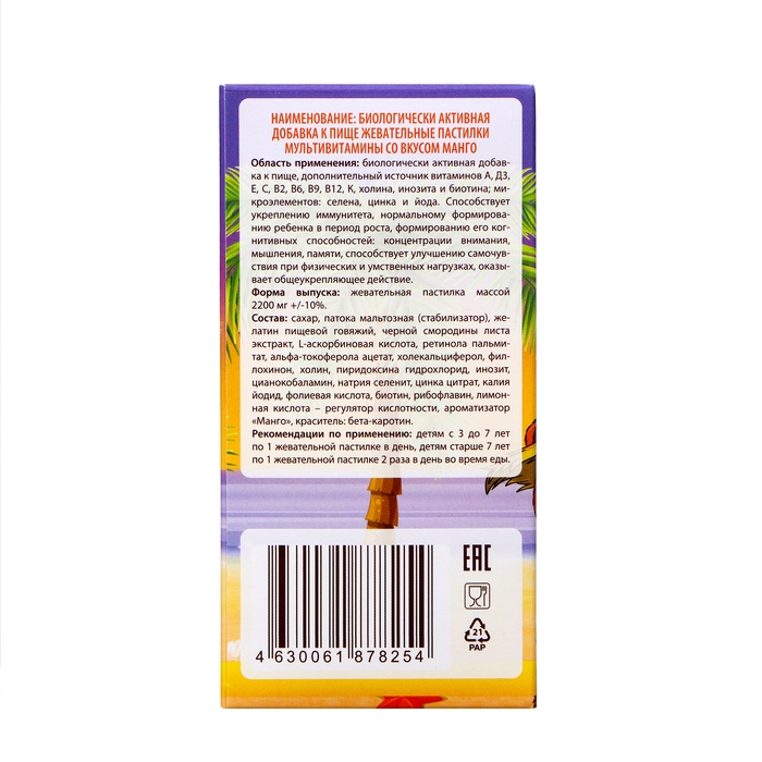 Состав: сахар, патока мальтозная (стабилизатор), желатин пищевой говяжий, черной смородины листа экстракт, L-аскорбиновая кислота, ретинола пальмитат, альфа-токоферола ацетат, холекальциферол, филлохинон, холин, пиридоксина гидрохлорид, инозит, цианокобаламин, натрия селенит, цинка цитрат, калия йодид, фолиевая кислота, биотин, рибофлавин, лимонная кислота – регулятор кислотности, ароматизатор «Манго», краситель: бета-каротин.