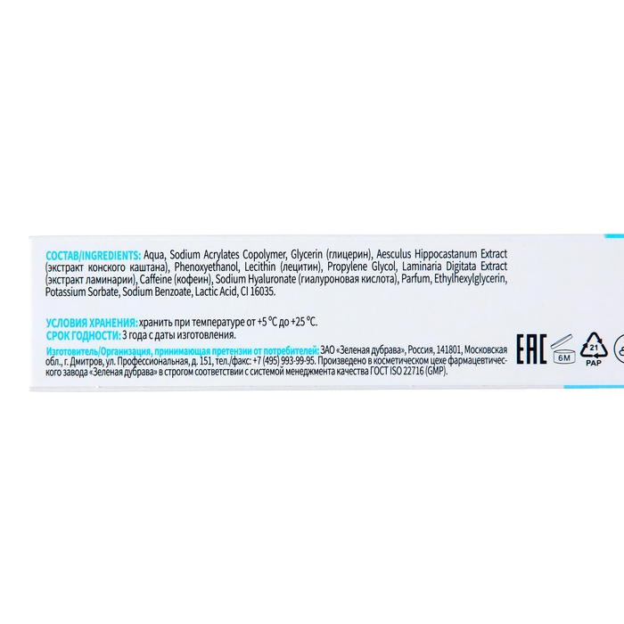 Комплекс активных компонентов (экстракт конского каштана, кофеин, глицерин, лецитин и экстракт ламинарии) – стимулирует восстановление кожи, обеспечивает её мягкость и упругость, помогают справиться с отеками, темными кругами.