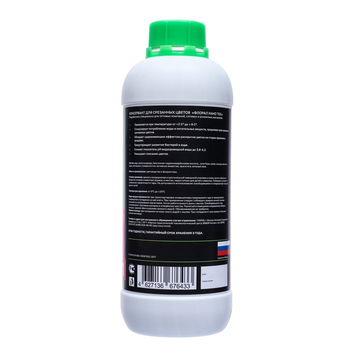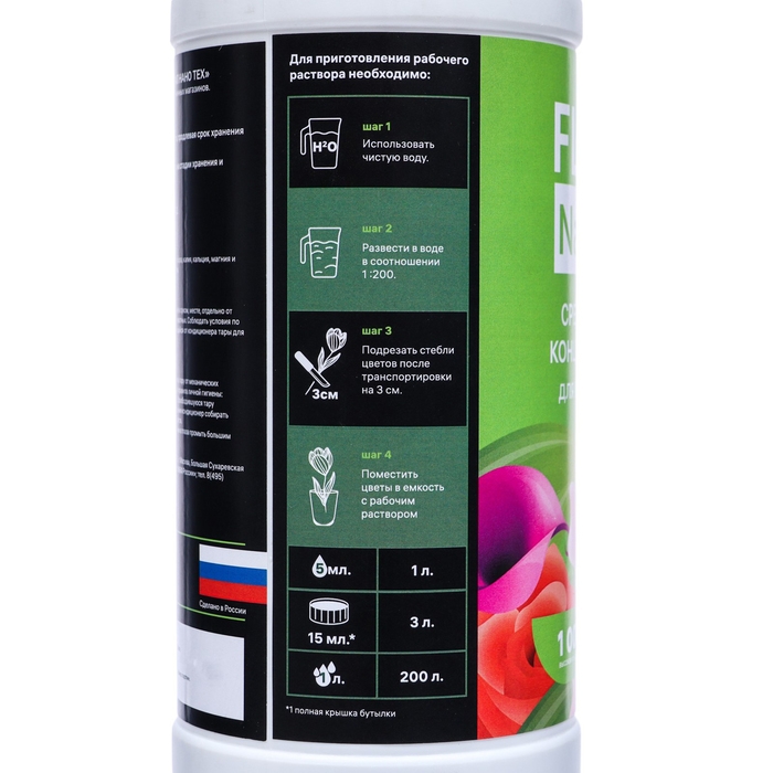 Жидкий концентрат для срезанных цветов, объемом 1 литр, предназначенный для ухода за срезанными цветами, является важным инструментом для сохранения свежести и красоты цветочных композиций. Разработанный под торговой маркой Floral NanoTech, данный продукт обладает рядом уникальных свойств, которые делают его незаменимым помощником в поддержании жизнеспособности цветов и продлении их декоративного эффекта.Основным преимуществом жидкого концентрата для срезанных цветов является его специальная формула, разработанная с использованием новейших технологий в области ухода за растениями. Эта формула обеспечивает оптимальное питание и увлажнение цветов, ускоряет процессы восстановления после срезки, а также защищает от негативного воздействия внешних факторов, таких как перепады температуры, солнечный свет и бактериальные инфекции. Благодаря этому цветы, обработанные концентратом, сохраняют свежесть и яркость на протяжении длительного времени, что делает их более привлекательными для покупателей и увеличивает сроки их экспозиции в торговых точках.Кроме того, жидкий концентрат для срезанных цветов имеет экономичную концентрацию, что позволяет использовать его в разбавленном виде и получить максимальную отдачу от каждой капли продукта. Это делает его выгодным и эффективным решением для профессиональных флористов, работающих с большими объемами цветочных материалов, а также для розничных точек продажи цветов, где необходимо обеспечить высокое качество представленной продукции при минимальных затратах на уход.Для использования жидкого концентрата не требуется специальных навыков или оборудования – он легко смешивается с водой и наносится на стебли цветов путем погружения или распыления. Это делает его удобным в применении и позволяет быстро и эффективно обрабатывать большие партии цветов без дополнительных затрат на персонал или оборудование.Компания Floral NanoTech обеспечивает высокое качество своей продукции, включая жидкий концентрат для срезанных цветов, благодаря строгому контролю производственных процессов и использованию только сертифицированных ингредиентов. Это гарантирует безопасность и эффективность продукта при любых условиях эксплуатации, а также соответствие всем санитарно-гигиеническим нормам и стандартам качества.В заключение, использование жидкого концентрата для срезанных цветов торговой марки Floral NanoTech позволяет обеспечить долговременное сохранение свежести и красоты цветочных композиций, что делает его незаменимым инструментом для профессиональных флористов, торговых точек продажи цветов и всех, кто заботится о создании привлекательной и долговечной флористической продукции.